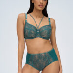 Трусики классические с высокой талией из коллекции выполнены в насыщенном летнем зелном цвете с глубокими голубыми оттенками из кружевного полотна, продублированного телесной сеткой, спинка из сетки, сложенной вдвое, с -образной вставкой кружева, на спинке вертикально присборены. Ластовица проложена 100 хлопком. Золотая люрексовая нить проходит через всю коллекцию, добавляя ей утончнного блеска и благородства.Chiara Gold classic трусы с завышенной талией (зелен) образец