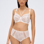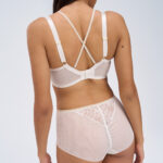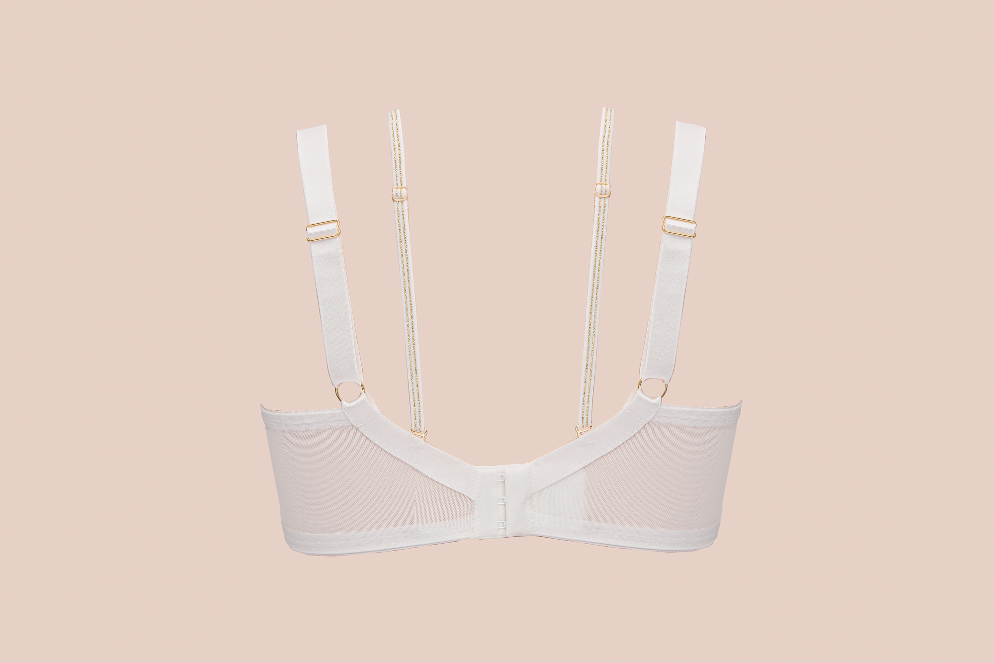 Бюстгальтер из коллекции выполнен в цвете - с мягкими чашечками на косточках, чашки шитые, из кружева, продублированы белой сеткой, декорированы тесьмой в тон. Спинка из стабилизирующей сетки. Бретельки регулируются по длине, не отстгиваются. В зоне декольте дополнительные съемные тонкие бретели, регулируются по длине, крепятся между чашками и на спинке, при желании их можно перекрещивать на спине. На спине застжка на удлинитель, количество крючков в ряду застжки увеличивается пропорционально размеру бюстгальтера, фурнитура металлическая цвета желтого золота. Золотая люрексовая нить проходит через всю коллекцию, добавляя ей утончнного блеска и благородства. Бюстгальтер идеально сочетается с трусиками из коллекции .Chiara Gold M бюст (белый)