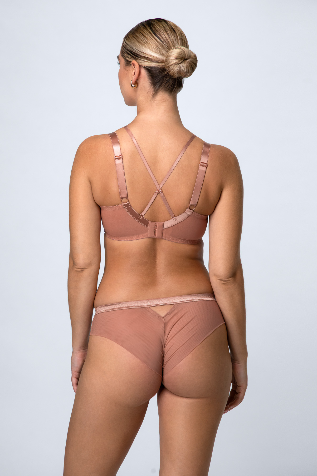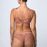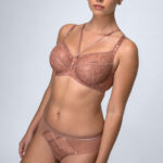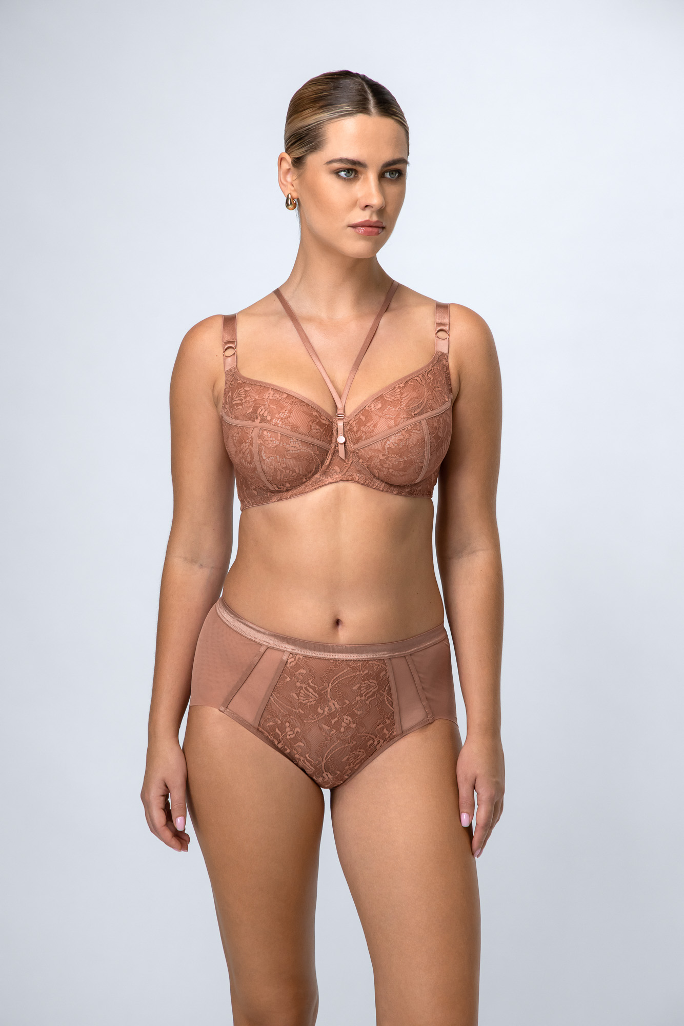 Бюстгальтер из коллекции выполнен с мягкими чашечками на косточках, чашки шитые, из кружева, продублированы сеткой в тон, декорированы тесьмой в тон. Спинка из стабилизирующей сетки. Бретельки регулируются по длине, не отстгиваются. В зоне декольте дополнительные съемные тонкие бретели, регулируются по длине, крепятся между чашками и на спинке, при желании их можно перекрещивать на спине. На спине застжка на удлинитель, количество крючков в ряду застжки увеличивается пропорционально размеру бюстгальтера, фурнитура металлическая цвета меди. Бюстгальтер идеально сочетается с трусиками из коллекции .Chiara M бюст (капучино)