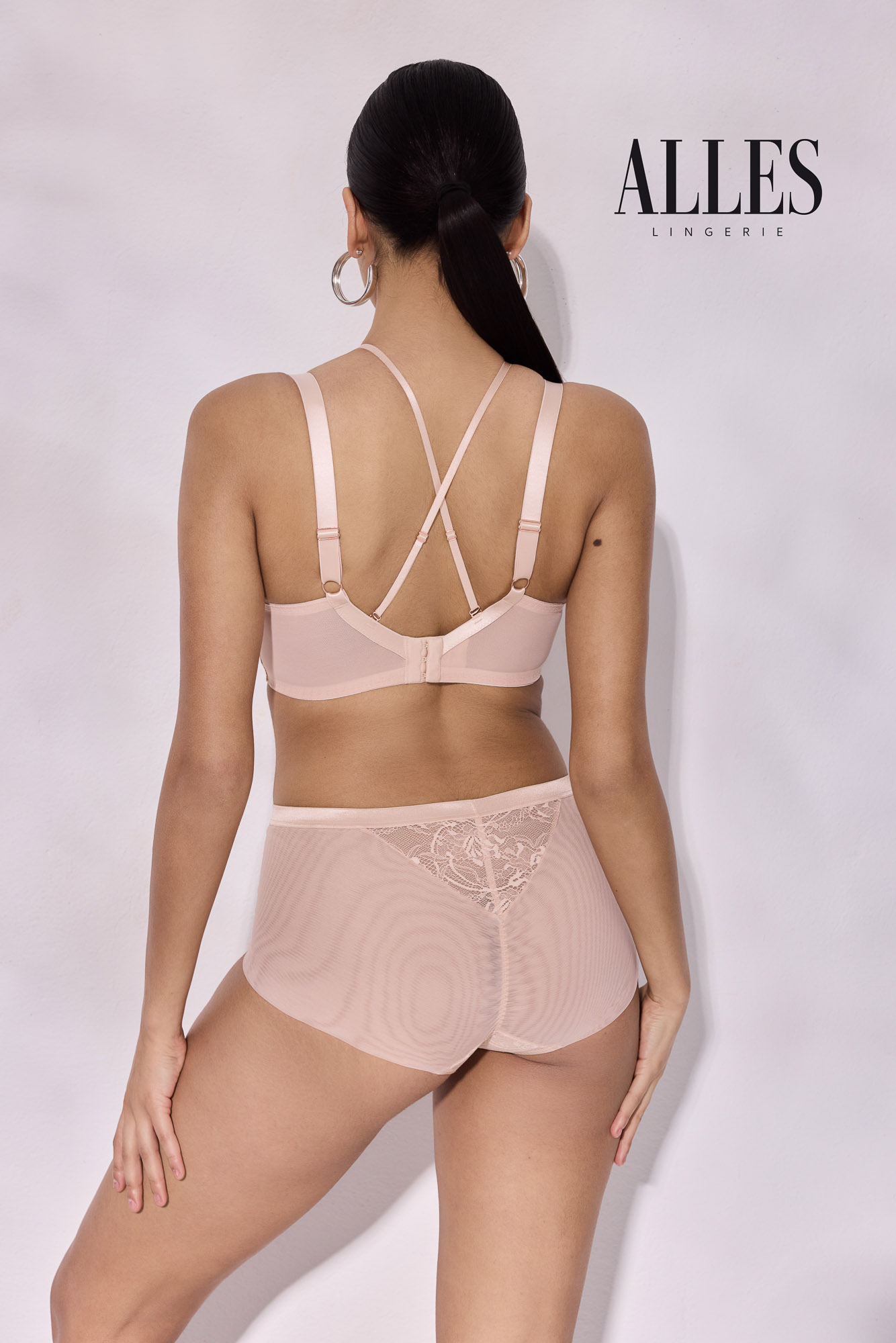 Трусики классические с высокой талией из коллекции выполнены в телесном цвете из кружевного полотна и сетки, спинка из сетки, сложенной вдвое, с -образной вставкой кружева. Ластовица проложена 100 хлопком.