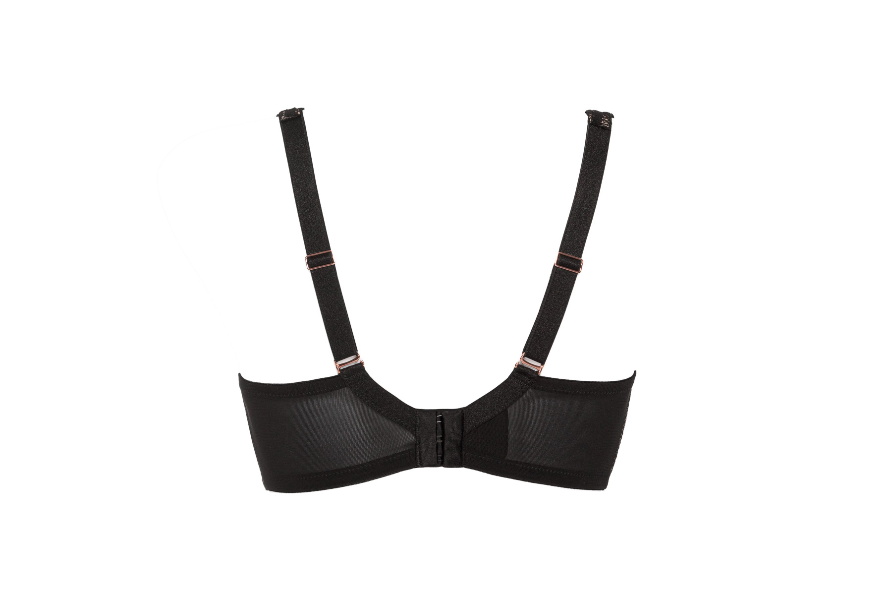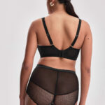 Бюстгальтер из коллекции с мягкими чашечками на косточках, чашки шитые, покрыты кружевом, продублированы телесной тканью, с дополнительными боковыми поддержками. Бретельки регулируются по длине, отстгиваются на спинке. Спинка из черной сетки. На спине застжка на удлинитель, количество крючков в ряду застжки увеличивается пропорционально размеру бюстгальтера. Бюстгальтер идеально сочетается с трусиками из коллекции .Chita M Plus бралетт бюст (черн)