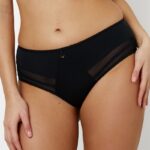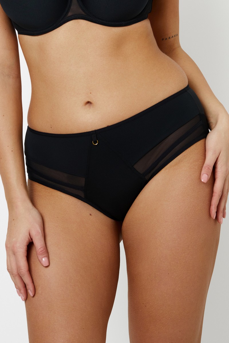 Трусы CHORS от европейского производителя Subtille. Модель конструкции бразильяно, с более широким боком, выполнена из микрофибры с добавлением вставок из микросетки. На попе двойной тюль. Спереди трусики декорированы золотистым небольшим колечком.CHORS BLACK Трусы