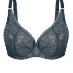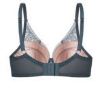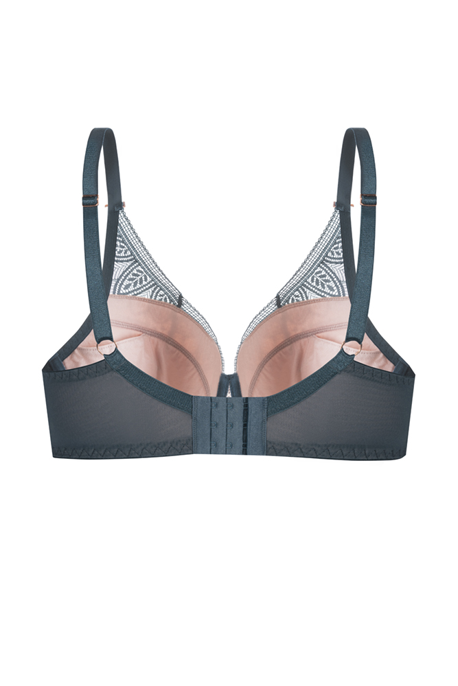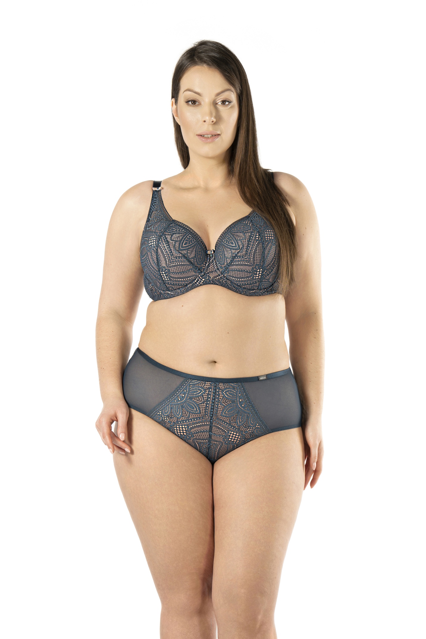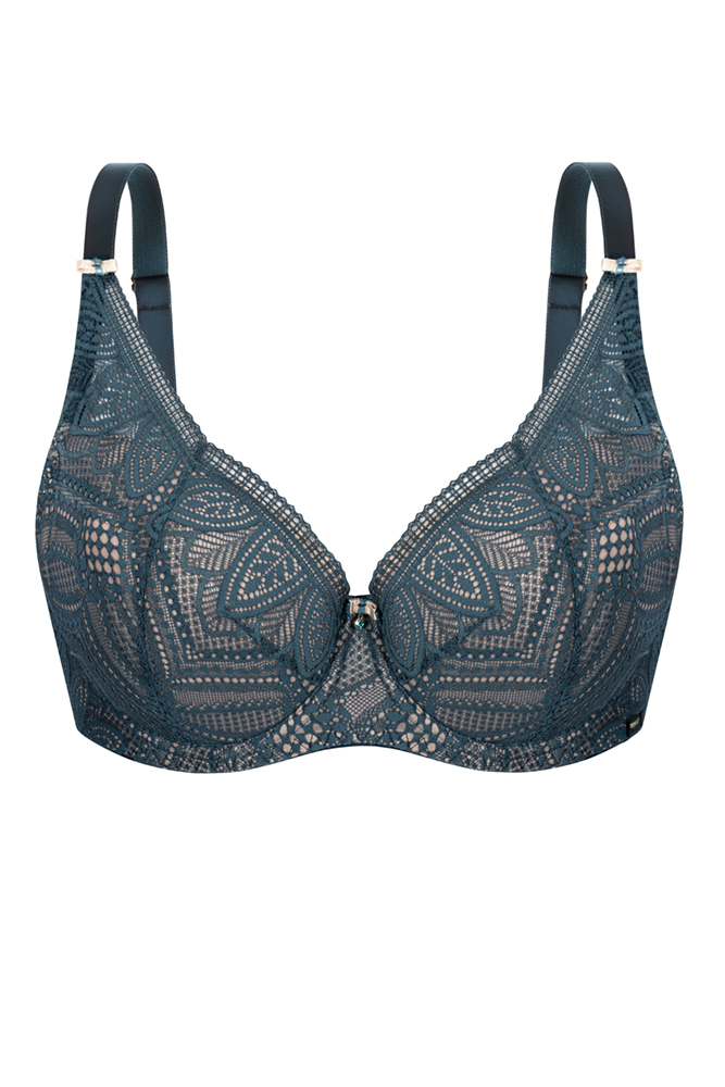 Бюстгальтер выполнен на косточках, с дополнительными боковыми поддержками, чашки шитые, на тонком поролоне телесного цвета, со съмными пуш-ап вкладышами, внутренняя сторона проложена хлопковым трикотажем, внешняя сторона чашек из кружева, спинка из сетки цвета деним продублирована телесной сеткой. Бретельки не отстгиваются, регулируются по длине. На спине застжка на удлинитель, количество крючков в ряду застжки, увеличивается пропорционально размеру бюстгальтера, фурнитура металлическая цвета меди. Бюстгальтер идеально сочетается с трусиками .Daniela U бюст BF25