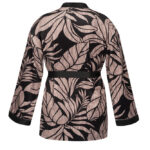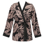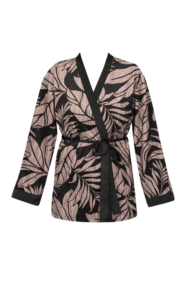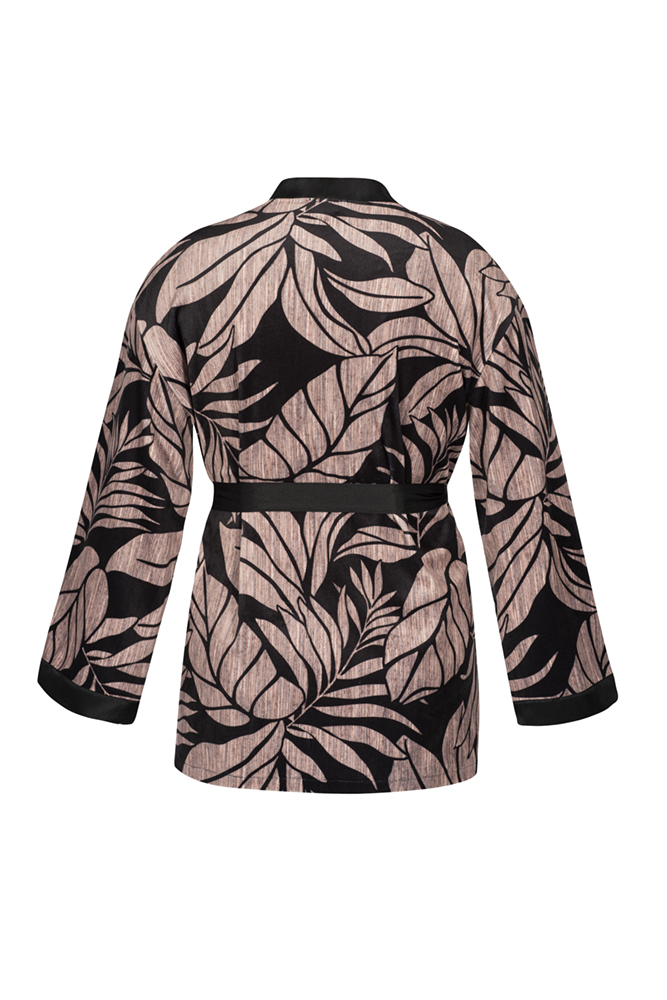 Халат короткий из тонкого велюра с растительным принтом, с длинным рукавом, на запах, с поясом. Манжеты, пояс и края полочек из тонкой черной ткани.