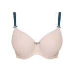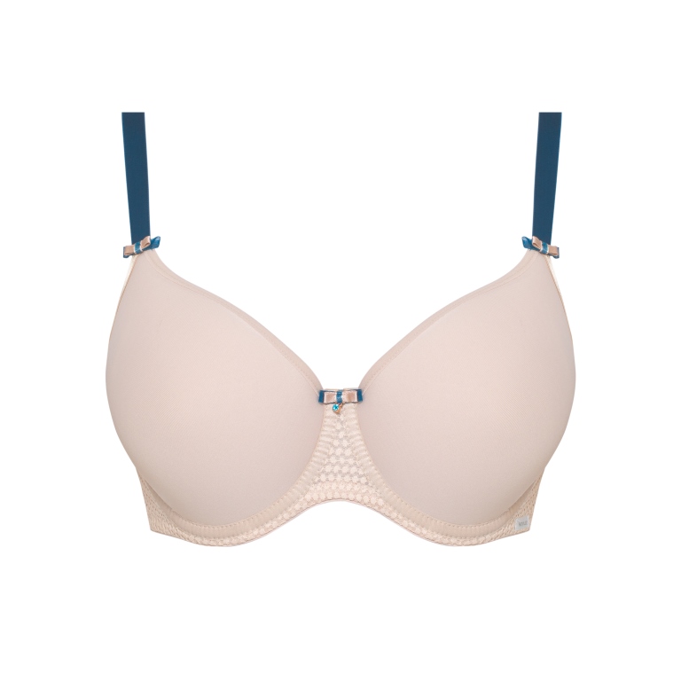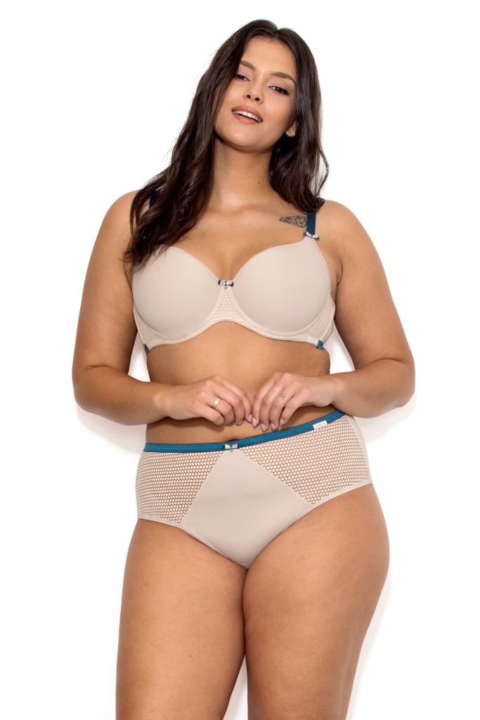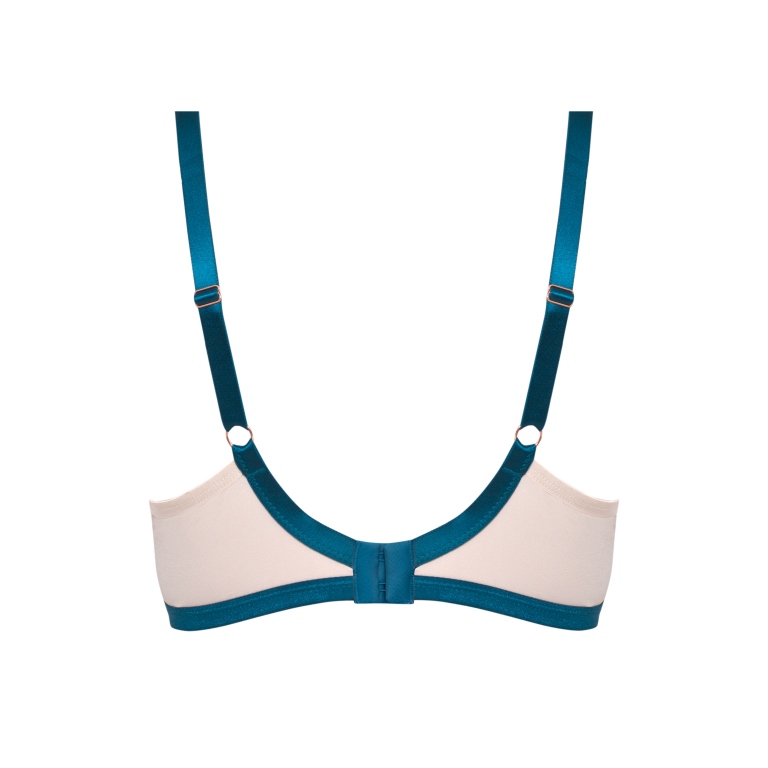 Бюстгальтер из гибридной пены сочетание чашки спейсер и формованной чашки, на косточках, с внутренней стороны чашки боковая поддержка, внешняя сторона чашек гладкая. Бретельки контрастного цвета пришиты, регулируются по длине. На спинке контрастные резинки, застжка на удлинитель, количество крючков в ряду застжки увеличивается пропорционально размеру бюстгальтера.