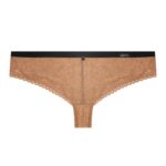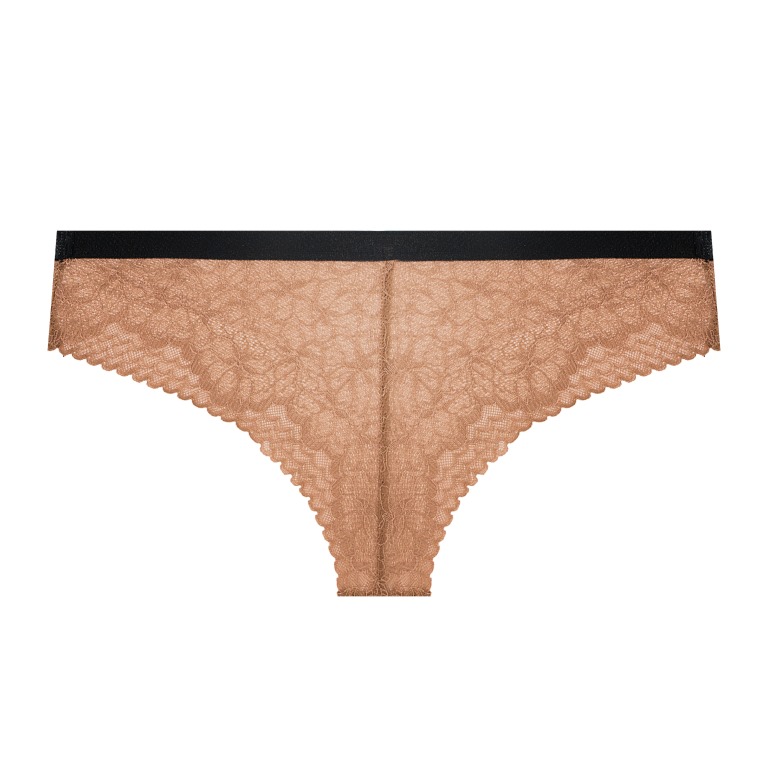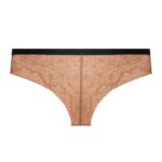 Трусики бразильяна из коллекции из кружевного полотна цвета карамель, спереди продублированы телесной сеткой, резинка эластичная контрастного черного цвета. Ластовица проложена 100 хлопком телесного цвета. Трусики идеально комплектуются с бюстгальтерами .Elisabeth трусы бразильянки DB75