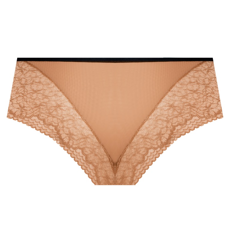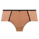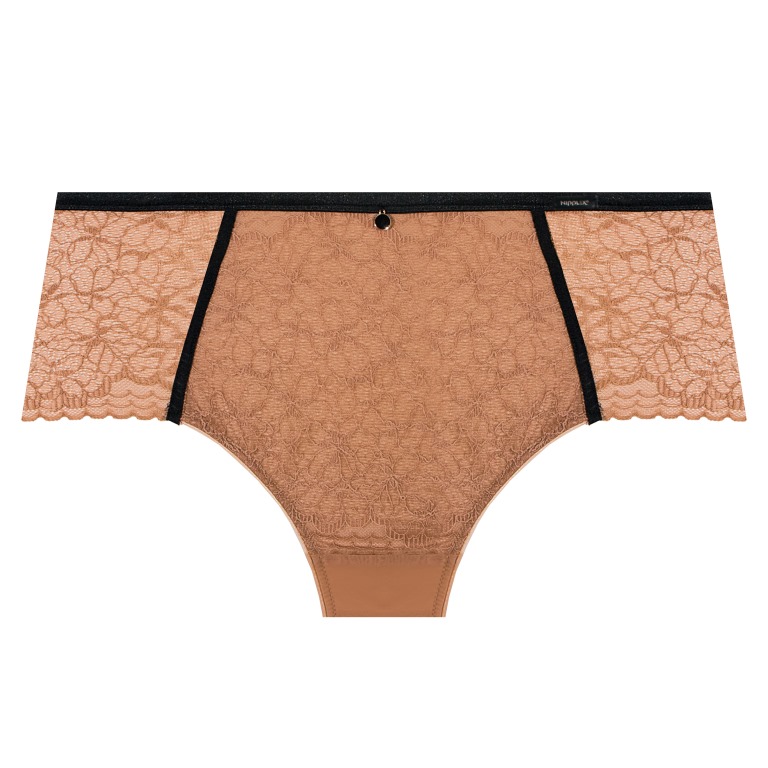 Трусики слип с высокой линией талии из коллекции созданы из кружевного полотна цвета карамель, спереди продублированы телесной сеткой, спинка из кружева с -образной вставкой из 2-х слоев сетки, резинка контрастного черного цвета. Атласные черные ленты спереди визуально придают стройности силуэту. Ластовица проложена 100 хлопком телесного цвета. Трусики идеально комплектуются с бюстгальтерами .