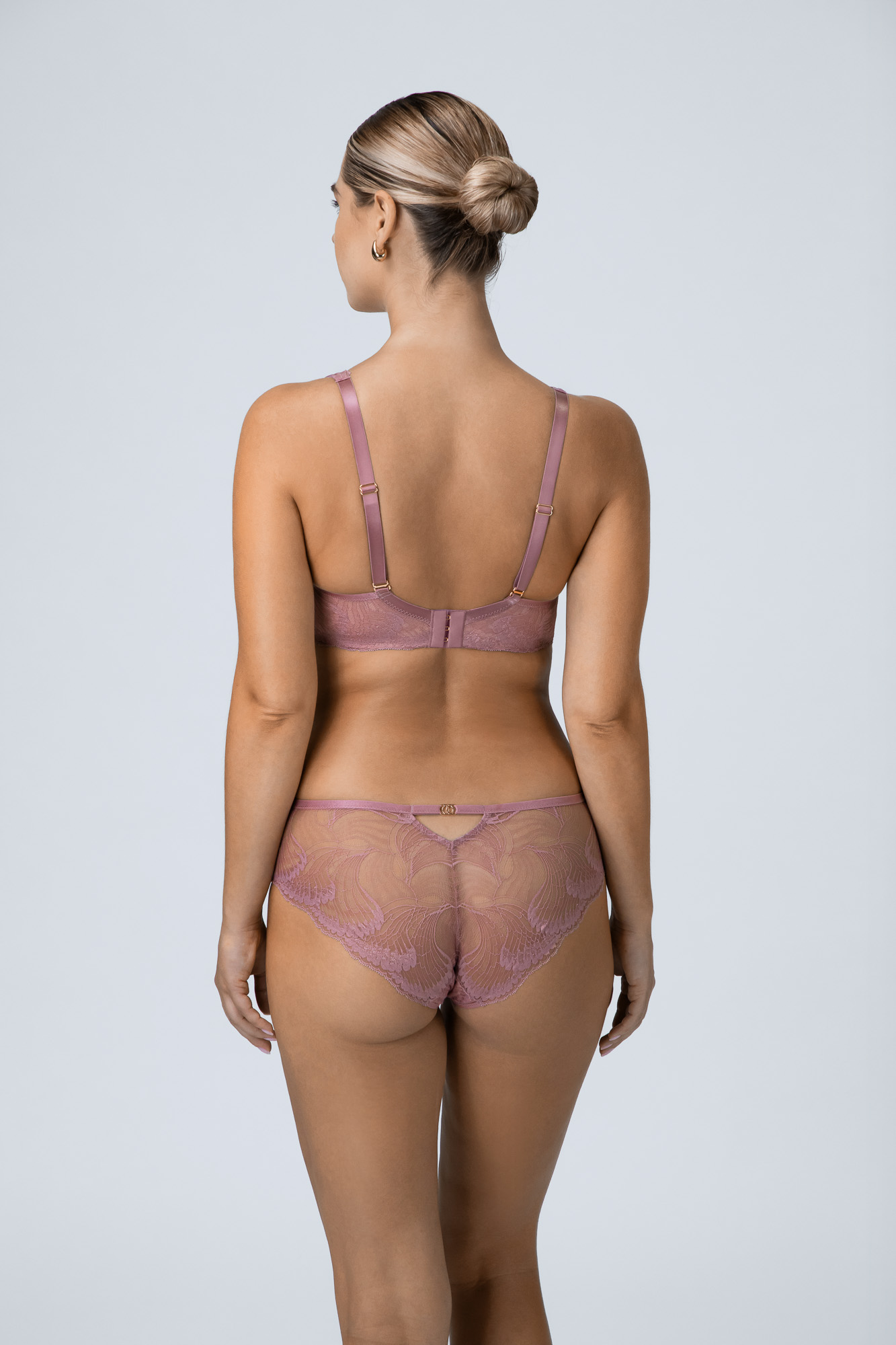 Бюстгальтер-бралетт из коллекции выполнен на основе бюста с мягкими, шитыми из роскошного кружева чашками, продублированными розовой сеткой, на косточках, с дополнительными боковыми поддержками. Пояс кружевной продублирован сеткой. Широкие бретели с подкладкой из мягкого пеноматериала регулируются по длине, не отстгиваются. На спине застжка на удлинитель, количество крючков в ряду застжки увеличивается пропорционально размеру бюстгальтера, фурнитура металлическая цвета розового золота. Бюстгальтер идеально сочетается с трусиками из коллекции .EssenzaRosa M Plus бралетт бюст