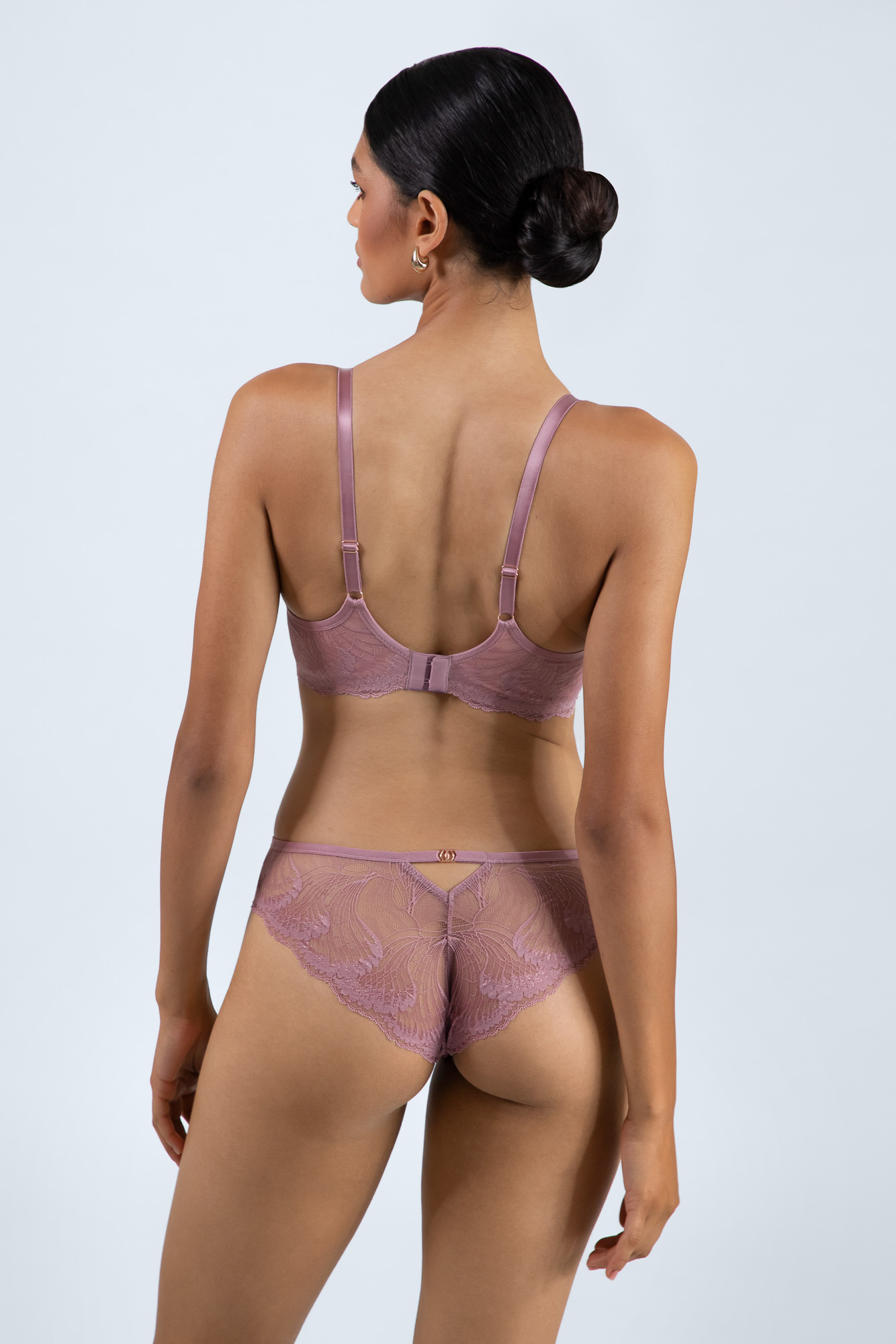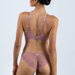 Бюстгальтер выполнен на основе бюста -, косточках на каркасах, с дополнительными боковыми поддержками, чашки шитые на тонком поролоне розового цвета, со съмными пуш-ап вкладышами, внешняя сторона чашки и спинка из роскошного кружева, пояс продублирован эластичной сеткой. Бретельки не отстгиваются, регулируются по длине. На спине застжка на удлинитель, количество крючков в ряду застжки, увеличивается пропорционально размеру бюстгальтера, фурнитура металлическая цвета розового золота. Бюстгальтер идеально сочетается с трусиками .
