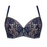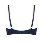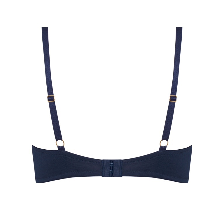 Бюстгальтер на косточках, с дополнительными боковыми поддержками, чашки шитые, на тонком поролоне телесного цвета, со съмными пуш-ап вкладышами, внутренняя сторона проложена хлопковым трикотажем, внешняя сторона чашек и спинка из тмно-синего кружева. Бретельки съмные, регулируются по длине. На спине застжка на удлинитель, количество крючков в ряду застжки, увеличивается пропорционально размеру бюстгальтера. Бюстгальтер идеально сочетается с трусиками .Eunika push up бюст