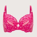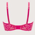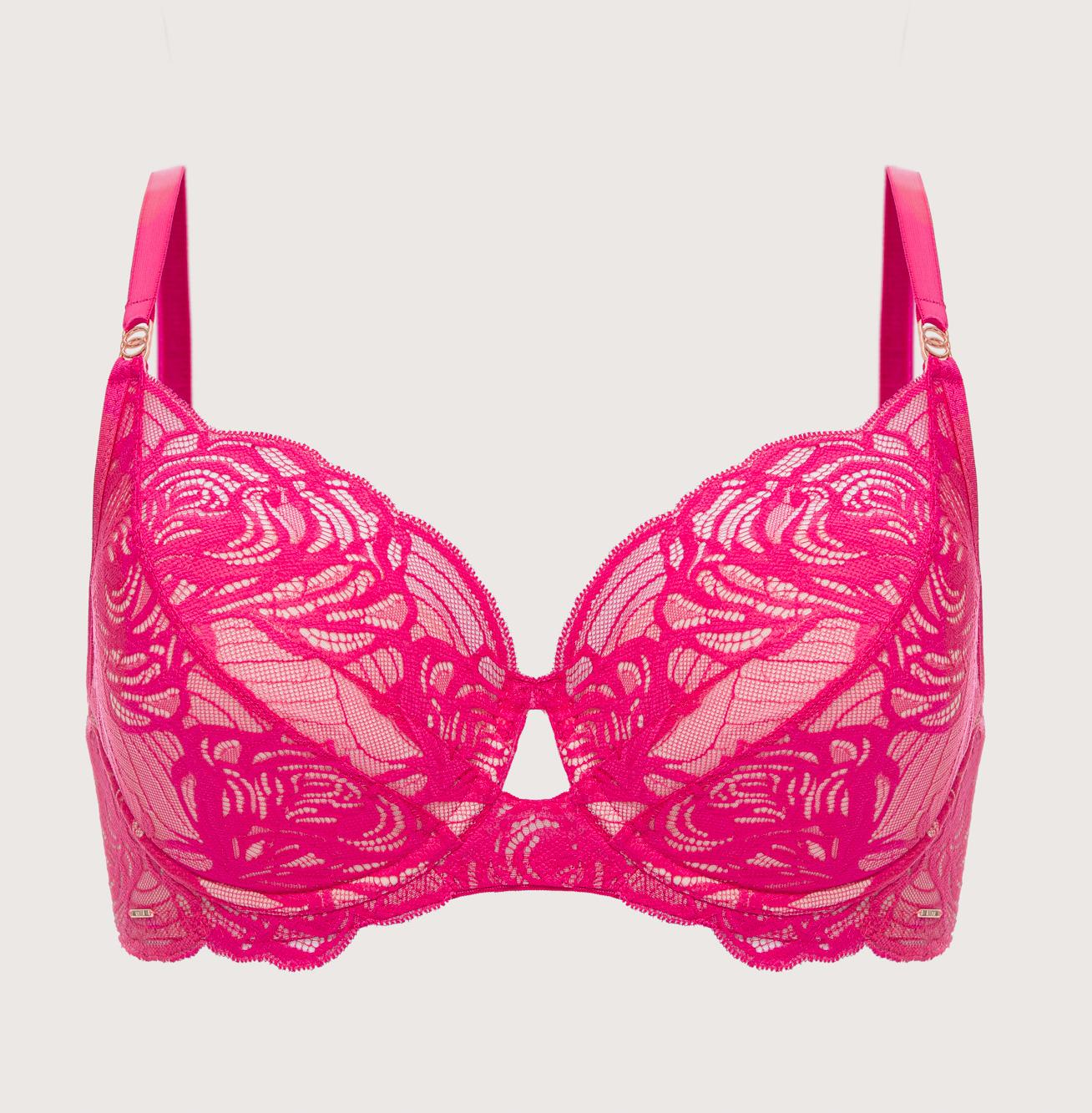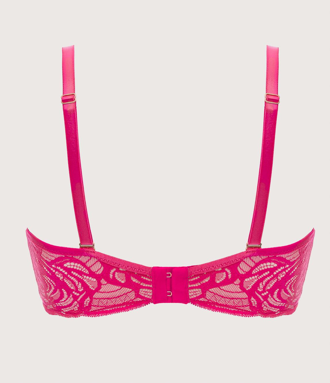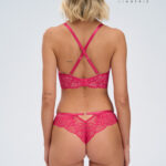 Бюстгальтер - выполнен на основе бюста - на косточках на каркасах, с дополнительными боковыми поддержками, чашки шитые на тонком поролоне телесного цвета, со съмными пуш-ап вкладышами, внешняя сторона чашки и спинка из ажурного кружева цвета амарант с гипнотическими абстрактными цветочными узорами, пояс продублирован эластичной телесной сеткой. Бретельки отстгиваются на спинке, регулируются по длине. На спине застжка на удлинитель, количество крючков в ряду застжки, увеличивается пропорционально размеру бюстгальтера, фурнитура металлическая матовая цвета розового золота. Между чашек продолговатое украшение с кристаллом цвета сапфир. Бюстгальтер идеально сочетается с трусиками .