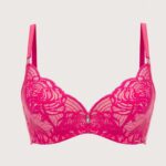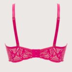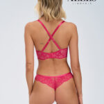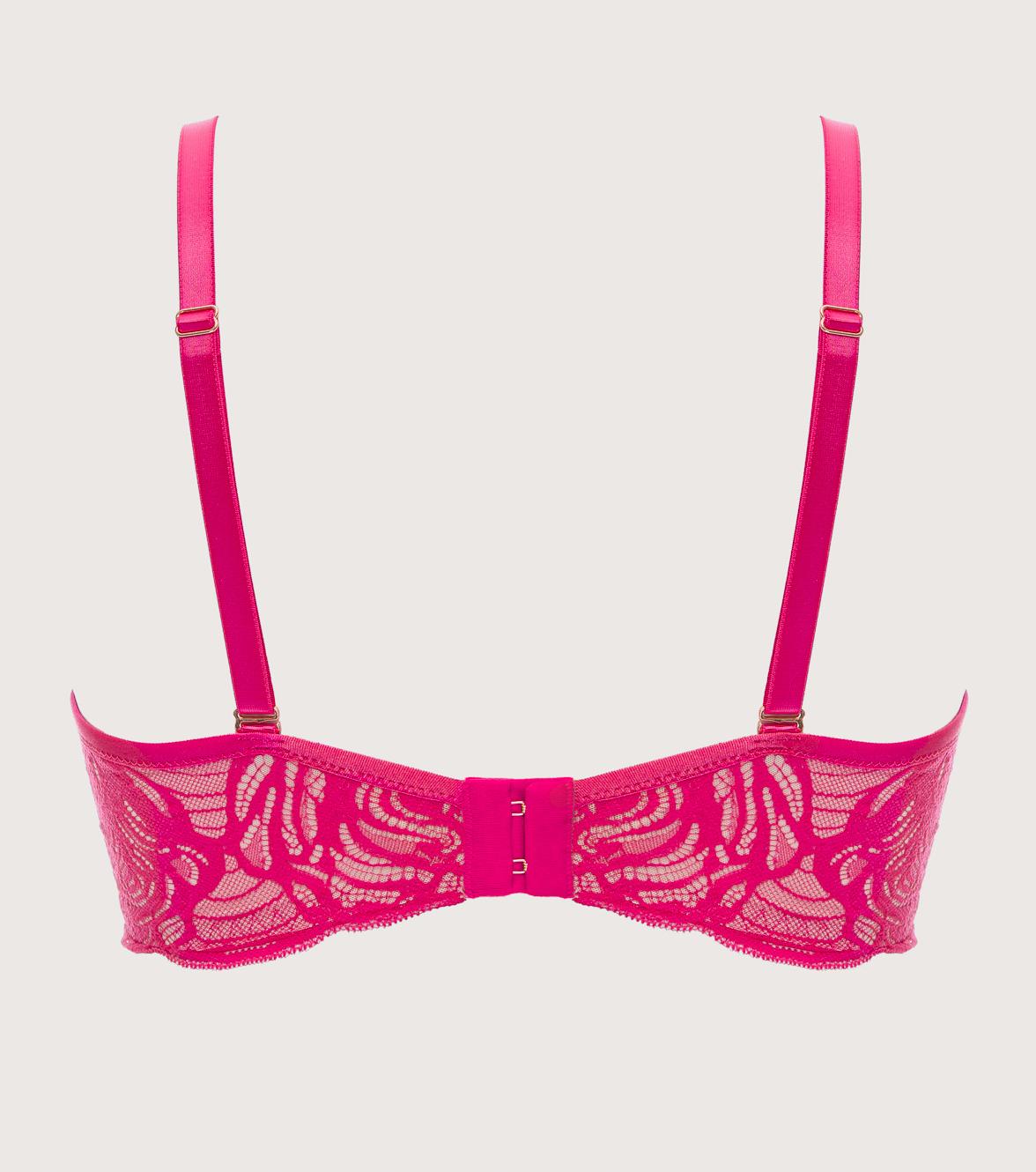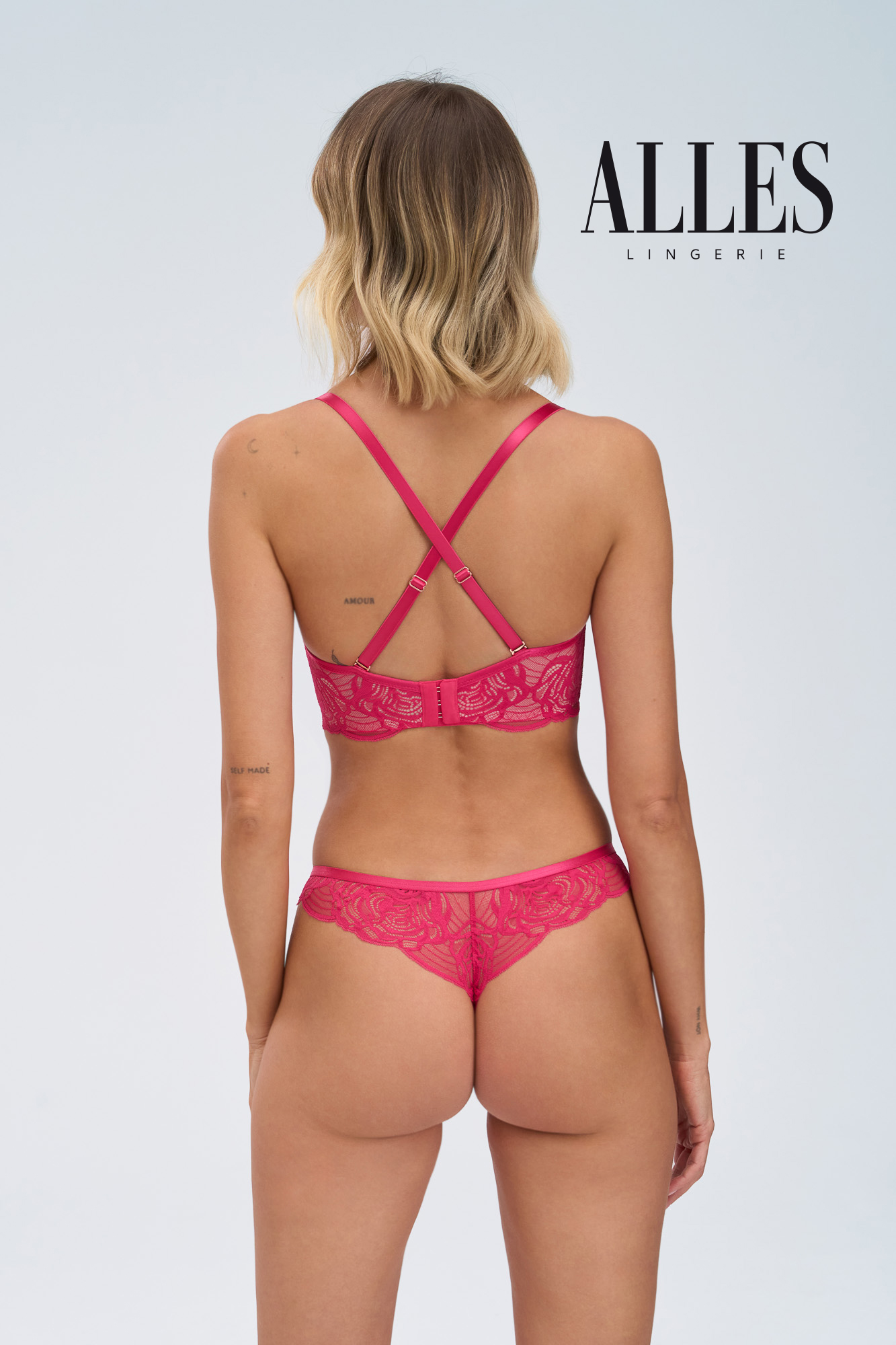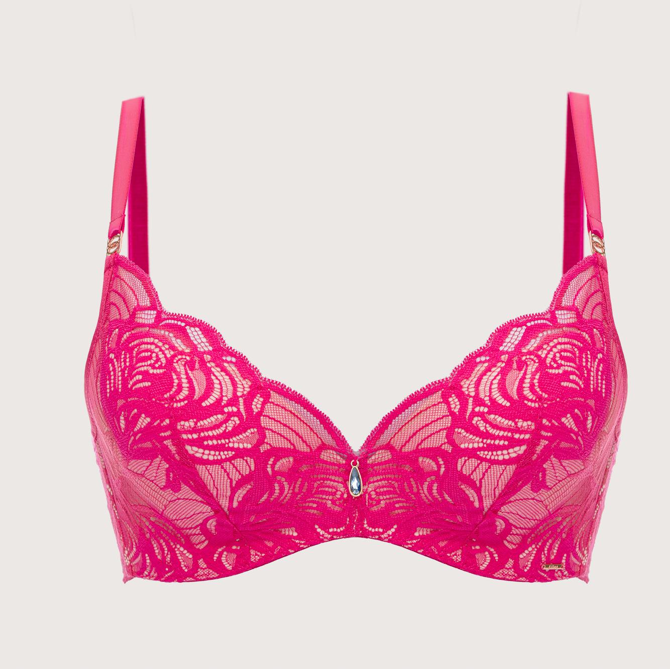 Бюстгальтер - выполнен на основе бюста - с формованными поролоновыми чашками телесного цвета без косточек, с дополнительными боковыми поддержками, внешняя сторона покрыта ажурным кружевом цвета амаранта с гипнотическими абстрактными цветочными узорами. Спинка кружевная продублирована телесной сеткой. Бретельки отстгиваются на спинке, регулируются по длине. На спине застжка на удлинитель, количество крючков в ряду застжки увеличивается пропорционально размеру бюстгальтера. Фурнитура металлическая цвета розового золота. Между чашек продолговатое украшение с кристаллом цвета сапфир. Бюстгальтер идеально сочетается с трусиками из коллекции .