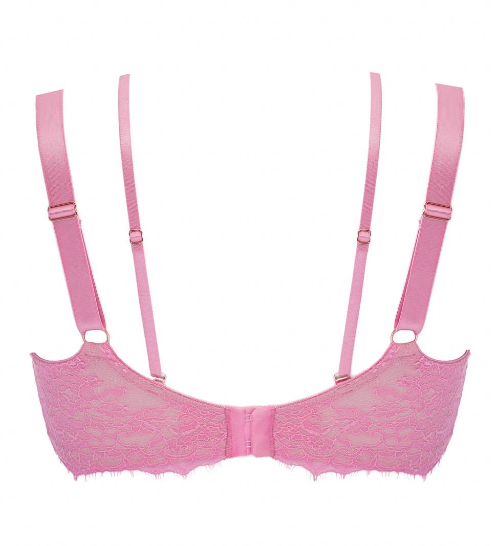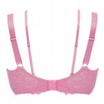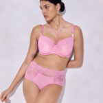 Бюстгальтер выполнен на основе бюста на косточках, с дополнительными боковыми поддержками, чашки шитые, нижняя часть чашек на тонком поролоне светло-розового цвета, верхняя и внешняя сторона из кружева с цветочным орнаментом с ресничками. Спинка из кружева продублирована розовой сеткой. Бретельки не отстгиваются, регулируются по длине. На спине застжка на удлинитель, фурнитура металлическая цвета розового золота. В зоне декольте дополнительные съемные тонкие бретели, регулируются по длине, крепятся между чашками и на спинке, при желании их можно перекрещивать на спине, Бюстгальтер идеально сочетается с трусиками .French Kiss PU big бюст