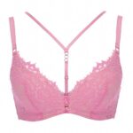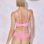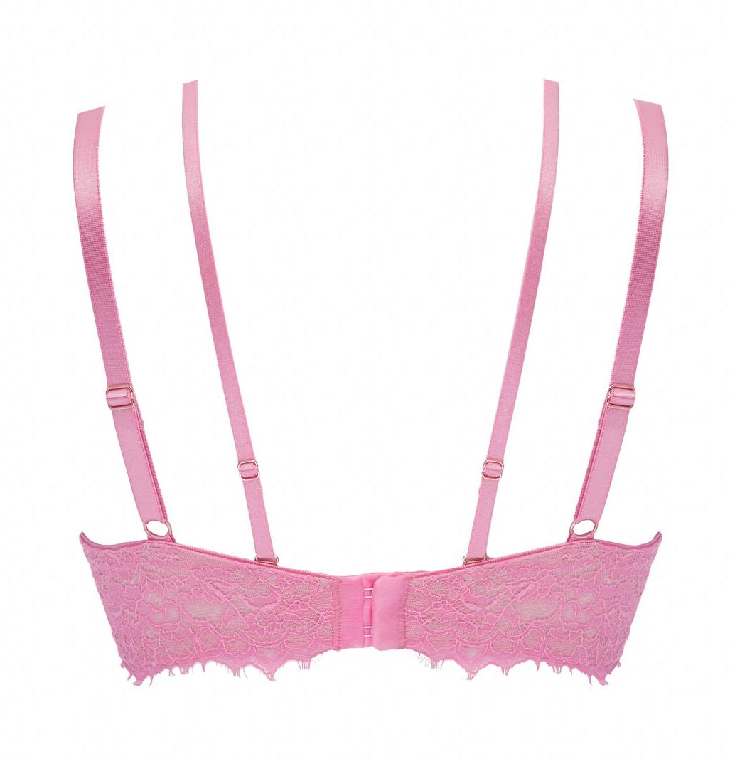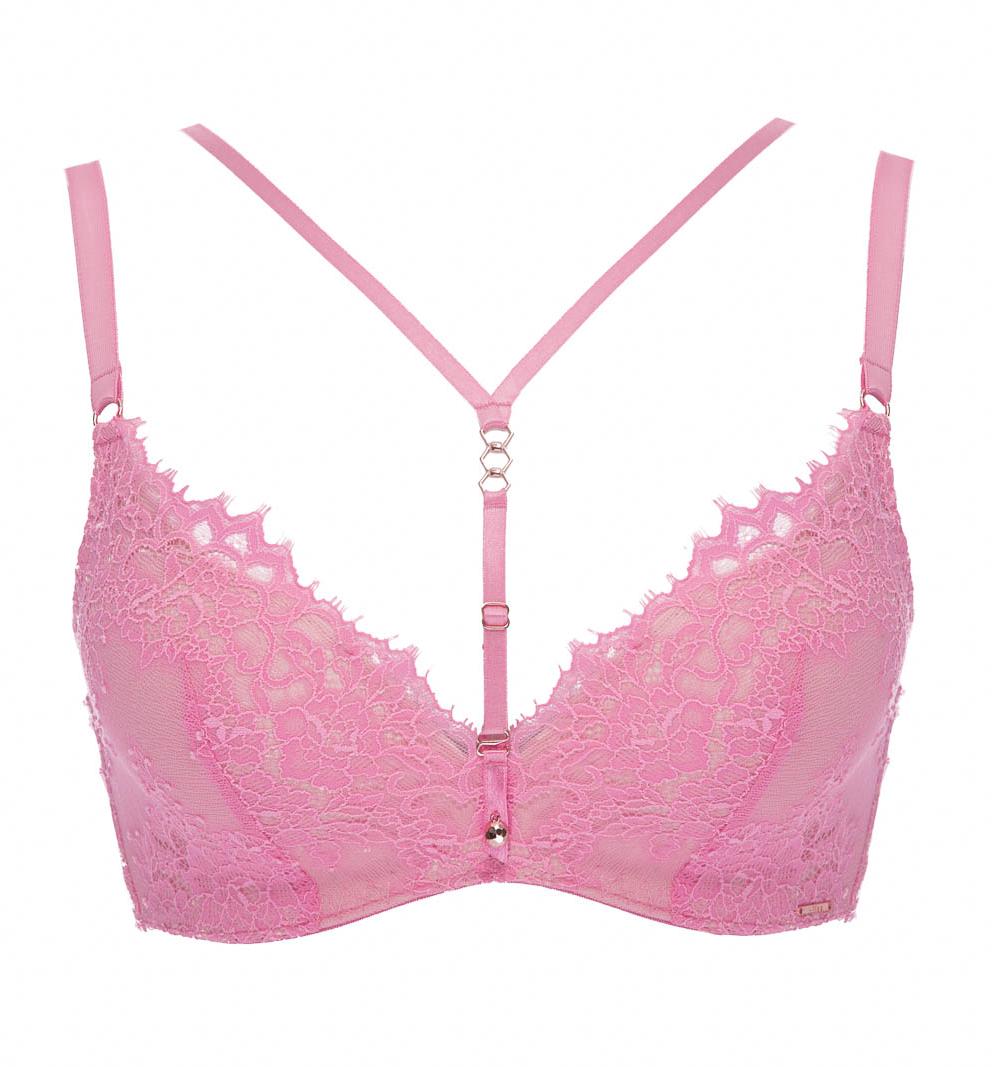 Бюстгальтер из коллекции - выполнен на основе бюста - с формованными поролоновыми чашками розового цвета без косточек, покрытыми нежным кружевом с ресничками, с дополнительными боковыми поддержками для предотвращения скручивания. Бретельки не отстгиваются, регулируются по длине. На спине застжка на удлинитель, количество крючков в ряду застжки увеличивается пропорционально размеру бюстгальтера. Пояс кружевной на подкладке из стабилизирующей сеточки. Фурнитура металлическая цвета розового золота. В зоне декольте дополнительные съемные тонкие бретели, регулируемые по длине. Бюстгальтер идеально сочетается с трусиками из коллекции .French Kiss Super P-UP бюст