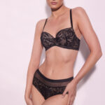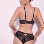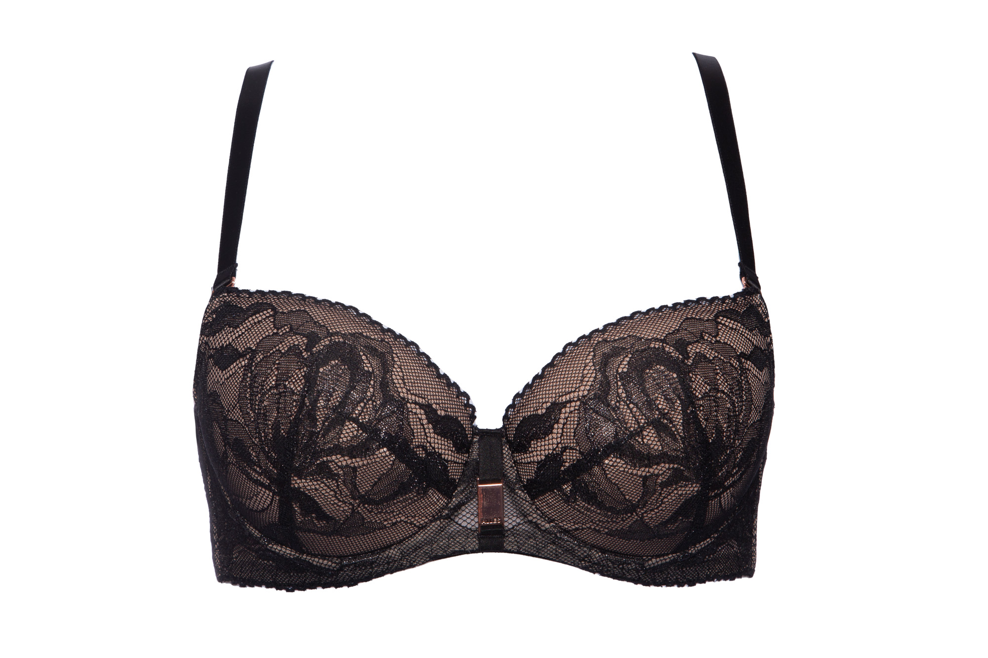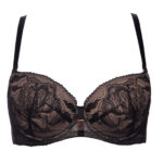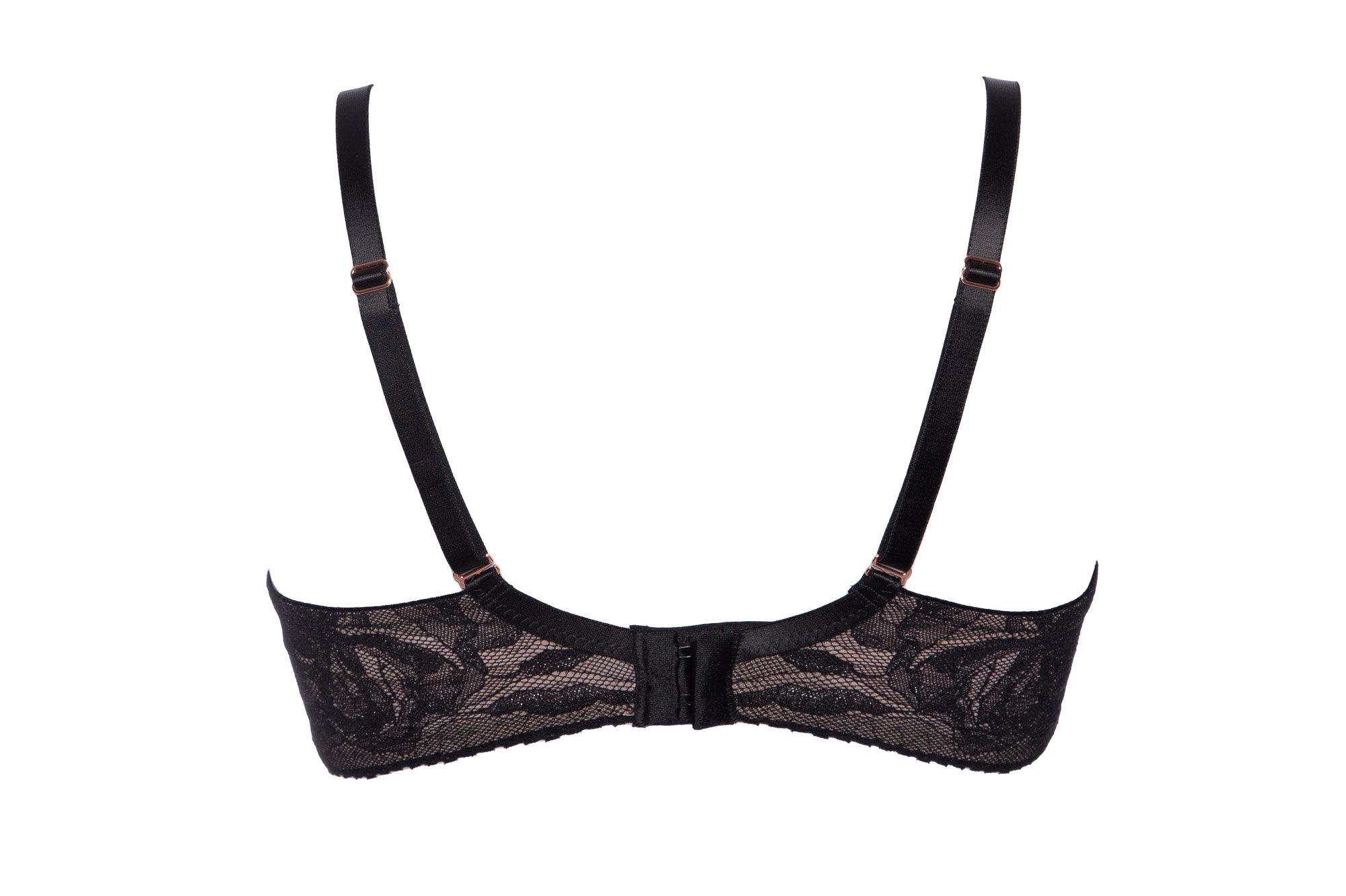 Бюстгальтер - выполнен на косточках, с дополнительными боковыми поддержками, чашки шитые на тонком поролоне телесного цвета, со съмными пуш-ап вкладышами, внешняя сторона покрыта нежным кружевом с черными цветами, с эффектом мерцания. Спинка из кружева продублирована телесной сеткой. Бретельки с эффектом мерцания отстгиваются, регулируются по длине. На спине застжка на удлинитель, фурнитура металлическая цвета меди. Бюстгальтер идеально сочетается с трусиками .Frozen Black 01 P-UP бюст