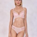 Бюстгальтер - выполнен на косточках, с дополнительными боковыми поддержками, чашки шитые на тонком поролоне розового цвета, со съмными пуш-ап вкладышами, внешняя сторона покрыта нежным кружевом с розовыми цветами, с эффектом мерцания. Спинка из сетки. Бретельки не отстгиваются, регулируются по длине. На спине застжка на удлинитель, количество крючков в ряду застжки, увеличивается пропорционально размеру бюстгальтера, фурнитура металлическая цвета меди. Бюстгальтер идеально сочетается с трусиками .