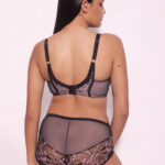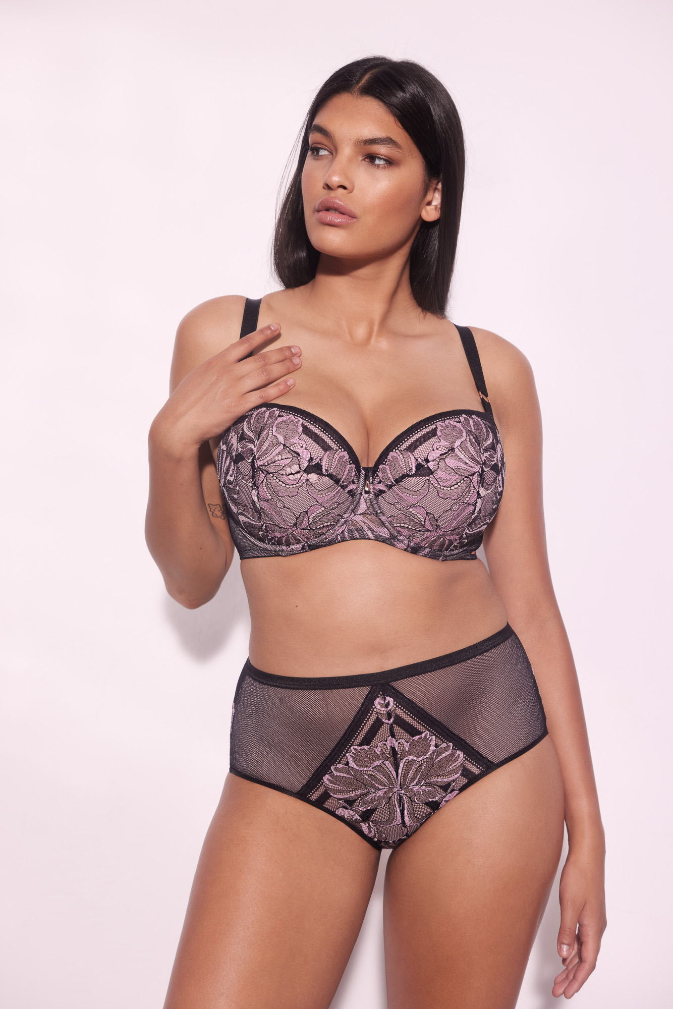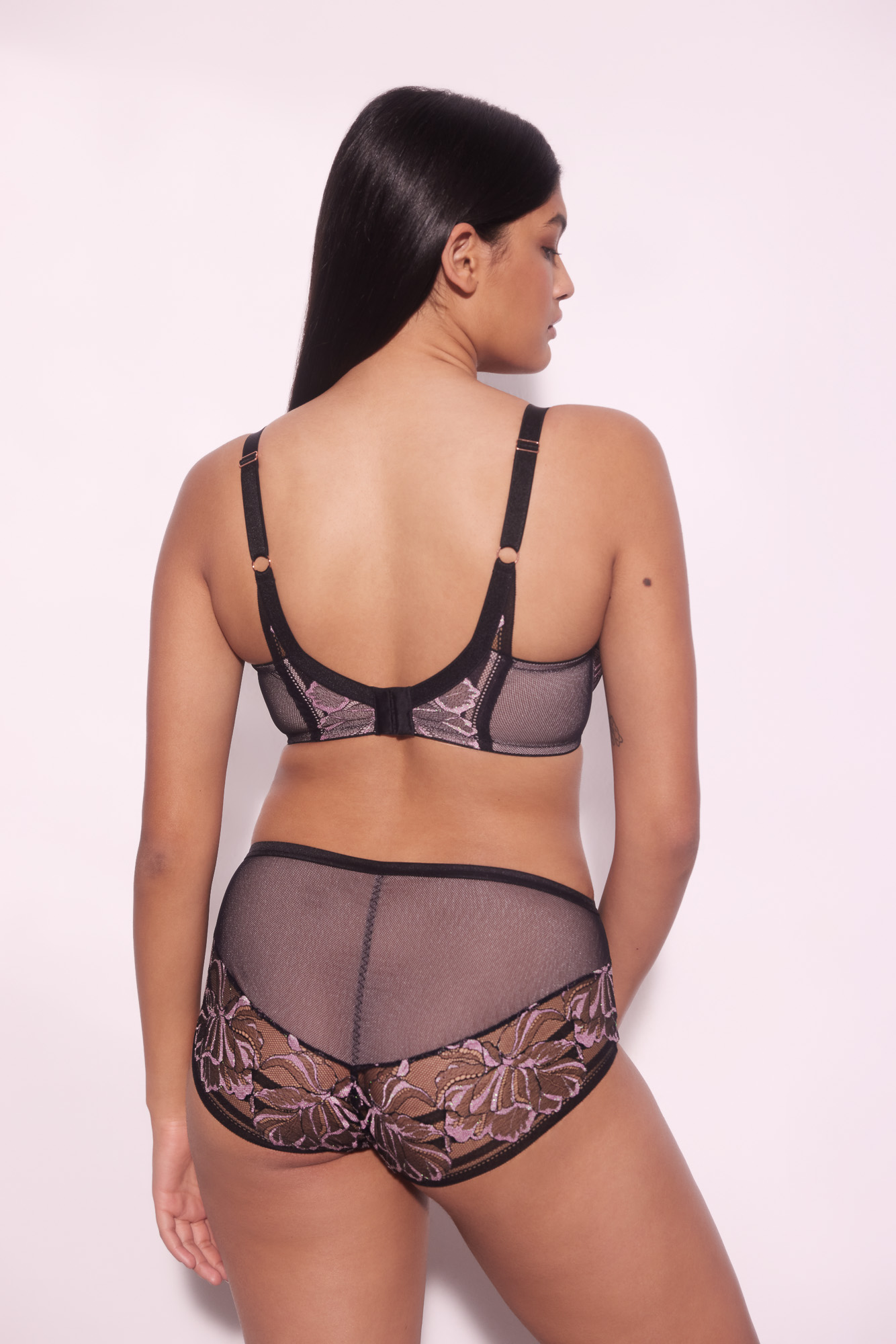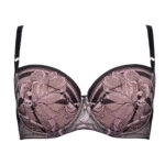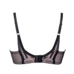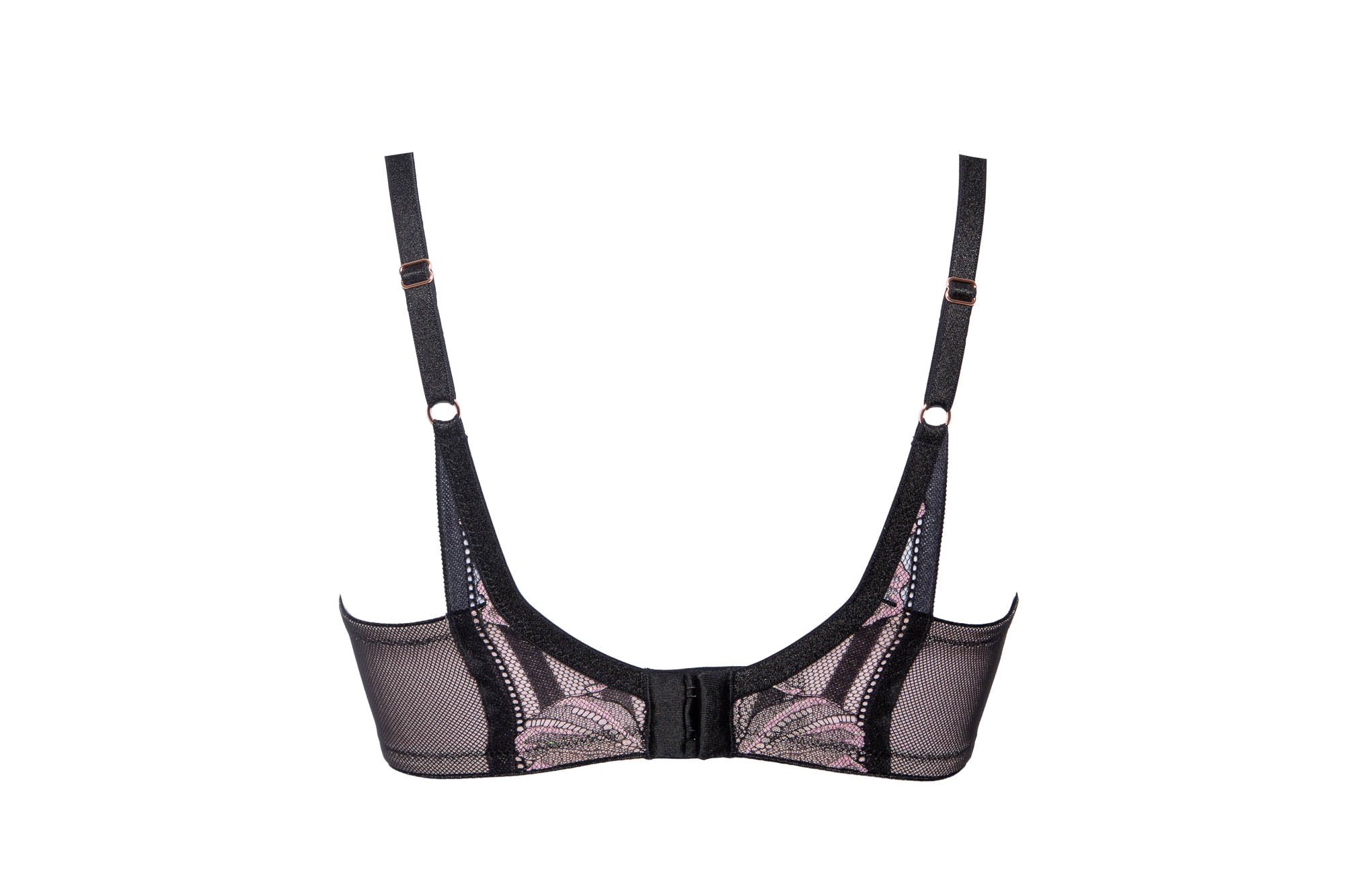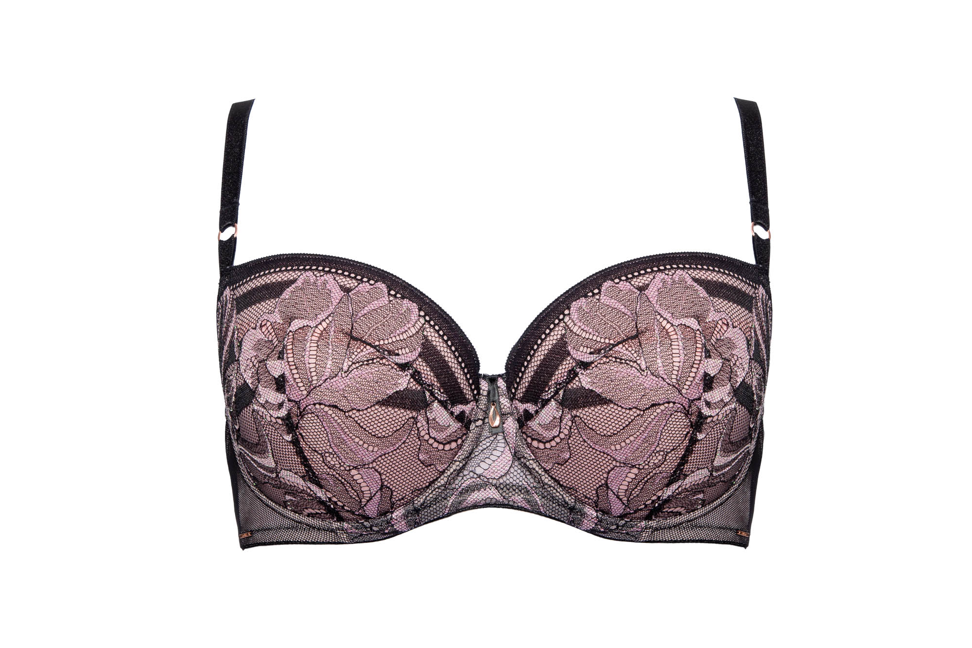 Бюстгальтер / выполнен на косточках, чашки шитые на тонком поролоне розового цвета, со съмными пуш-ап вкладышами, внешняя сторона покрыта нежным кружевом с черно-розовыми цветами, с эффектом мерцания. Спинка из черной сетки продублирована розовой сеткой. Бретельки не отстгиваются, регулируются по длине. На спине застжка на удлинитель, количество крючков в ряду застжки, увеличивается пропорционально размеру бюстгальтера, фурнитура металлическая цвета меди. Бюстгальтер идеально сочетается с трусиками .Glossy Iris U/W бюст