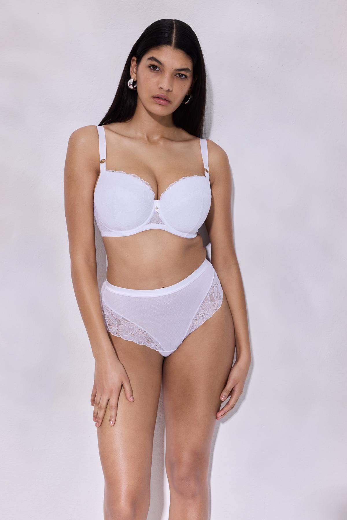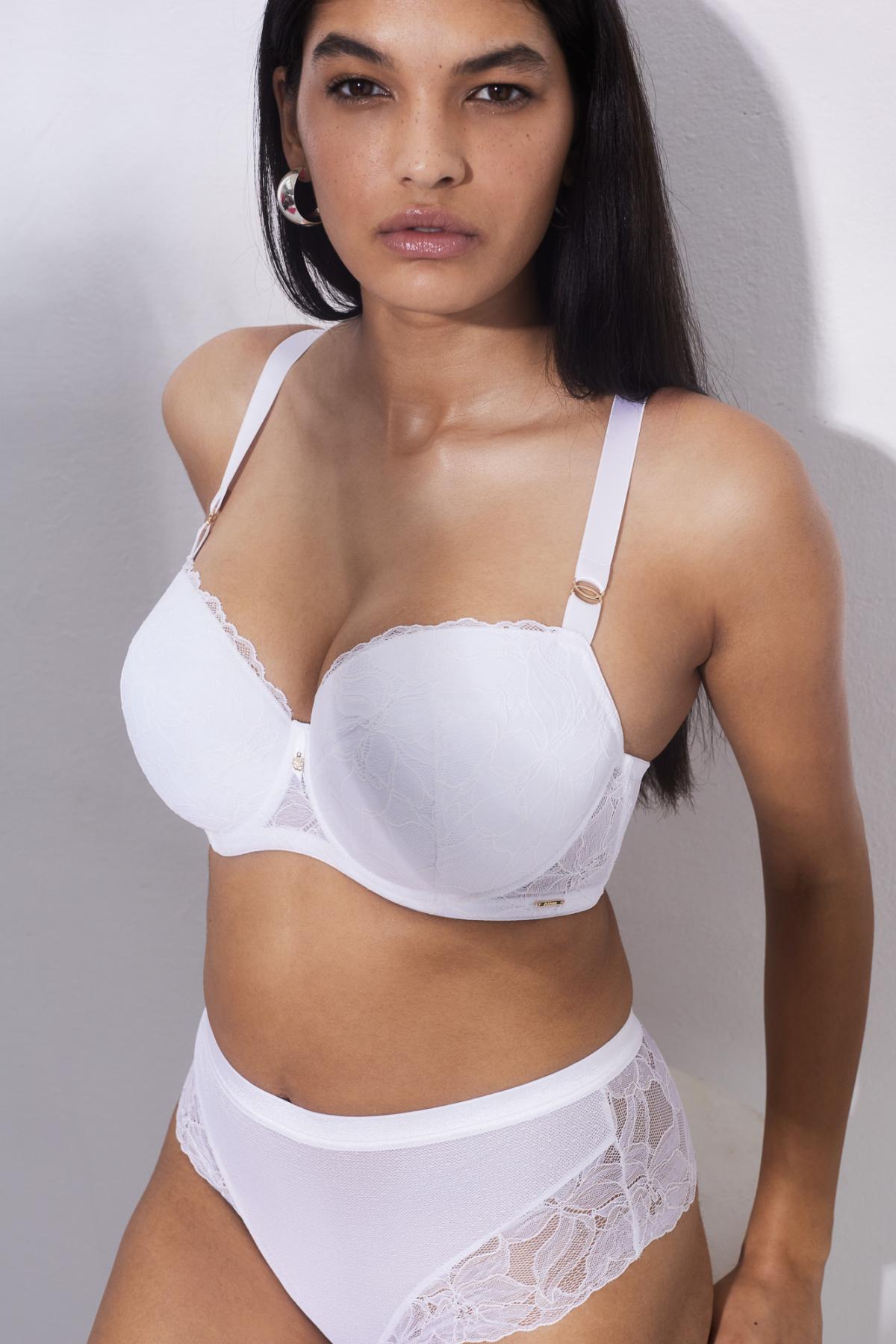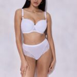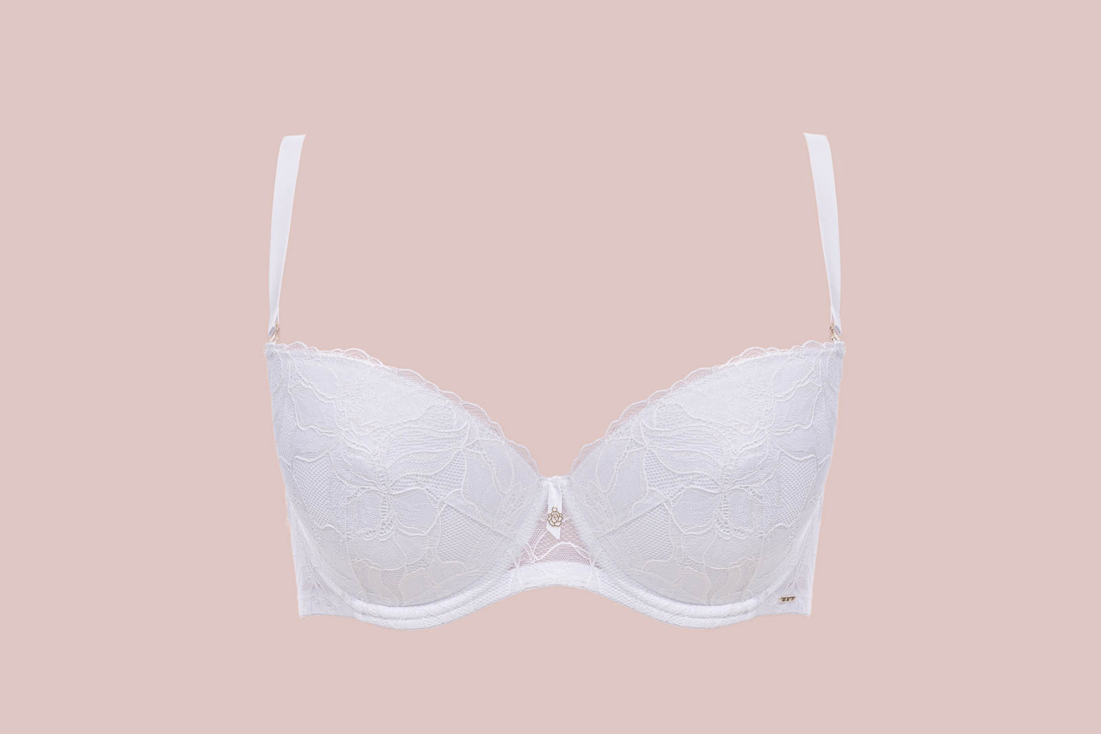 Бюст / выполнен на косточках на каркасах, чашки шитые на тонком поролоне, со съмными пуш-ап вкладышами, внешняя сторона из кружева с легким мерцающим эффектом, внутренняя проложена хлопком. Спинка из сетки в крапинку продублирована сеткой в тон. Бретельки не отстгиваются, регулируются по длине, фурнитура металлическая цвета желтого золота. На спине застжка на удлинитель, количество крючков в ряду застжки, увеличивается пропорционально размеру бюстгальтера. Бюстгальтер идеально сочетается с трусиками .