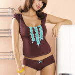 Комплект топ+шортики выполнен из эластичного материала шоколадного цвета с бирюзовым декором. Топ в области декольте украшен бирюзовыми рюшами, заканчивающимися бантиками. На шортиках спереди тоже маленький бантик бирюзового цвета.GOSSIP Top & Shorts Комплект из 2 частей