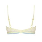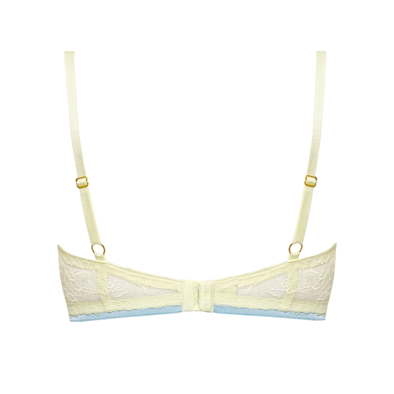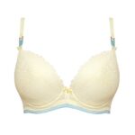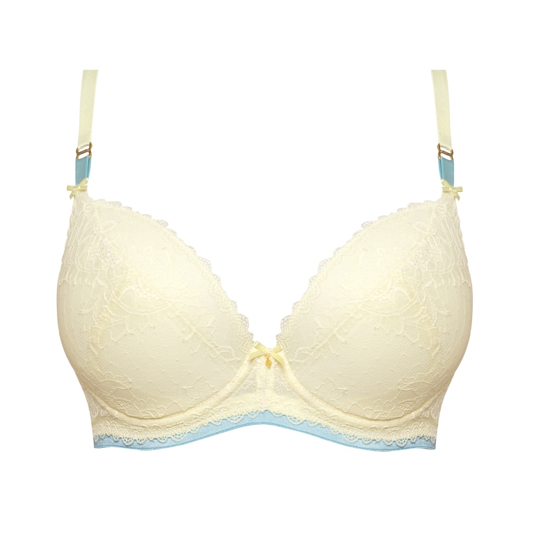 Бюстгальтер на косточках, с дополнительными боковыми поддержками, чашки шитые, на тонком поролоне, со съмными пуш-ап вкладышами, внутренняя сторона проложена хлопковым трикотажем, внешняя сторона чашек и спинка из жлтого кружева, по стану бюстгальтера пристрочена голубая резинка. Бретельки отстгиваются на спинке, регулируются по длине. На спине застжка на удлинитель, количество крючков в ряду застжки, увеличивается пропорционально размеру бюстгальтера. Бюстгальтер идеально сочетается с трусиками .
