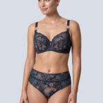 Трусики слип со средней линией талии из коллекции выполнены из кружева цвета , спереди продублированы телесной сеткой, на спинке -образный вырез, фурнитура металлическая цвета меди. Ластовица проложена 100 хлопком телесного цвета.IndigoAffair трусы