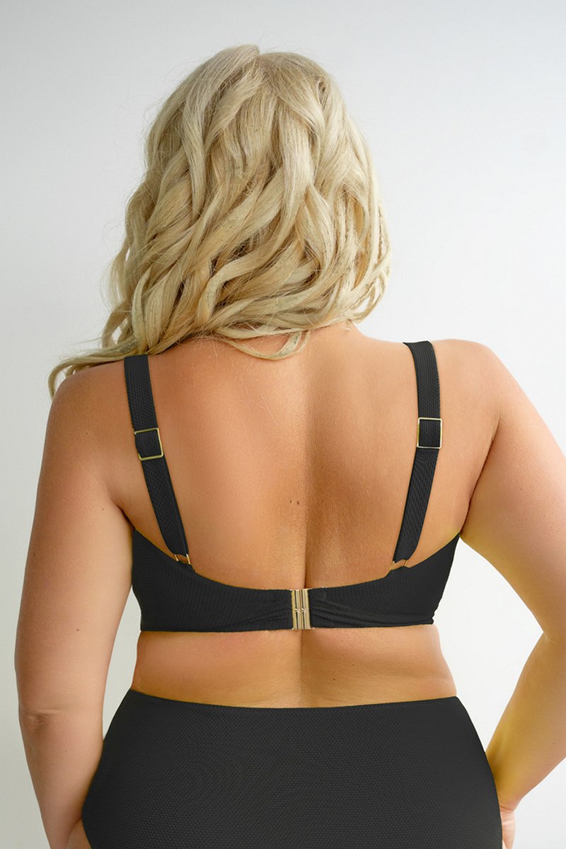 Мягкий купальный бюстгальтер на кости с боковой панелью, собирающий бюст внутрь. Бюстгальтер выполнен из прочного материала. Кроме того, низ выполнен из двойного трикотажа (внутренний шов), который создает дополнительный комфорт для женщины с очень чувствительной кожей. Ткань текстурная. Застежка на спине. Несъемные регулируемые бретели. Золотые аксессуары.LEMON BLACK Softfullcup Бюст купальный