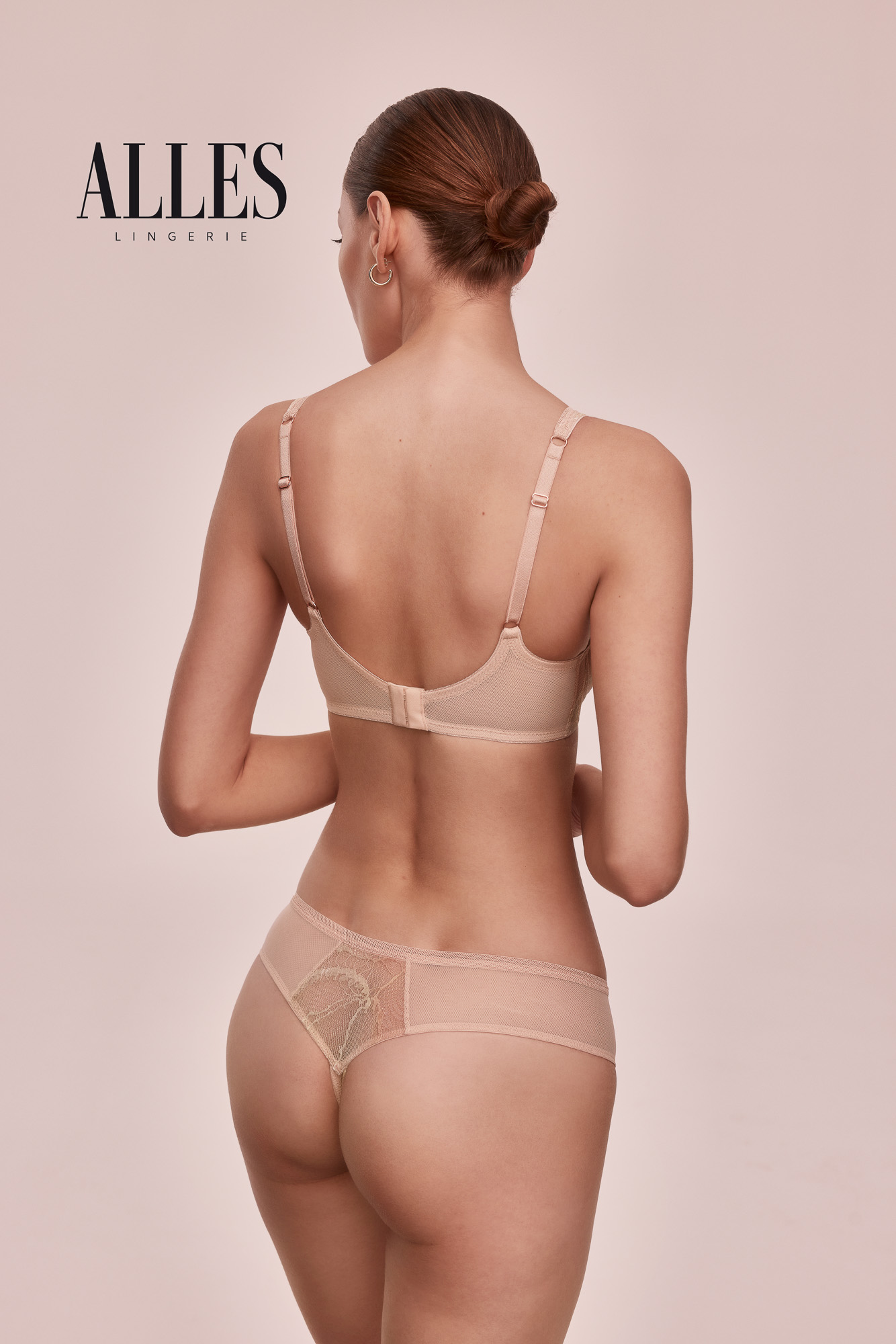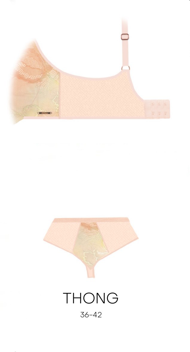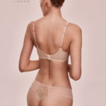 Бюстгальтер из коллекции выполнен на основе бюста бралетт с мягкими чашечками на косточках, чашки шитые из двухцветного кружева, продублированы телесной тканью, с дополнительными боковыми поддержками. Бретельки регулируются по длине, не отстгиваются. Пояс из двух слоев телесной сетки. Фурнитура металлическая цвета меди. На спине застжка на удлинитель, количество крючков в ряду застжки увеличивается пропорционально размеру бюстгальтера. Бюстгальтер идеально сочетается с трусиками из коллекции .Loretto M Plugne бралетт бюст