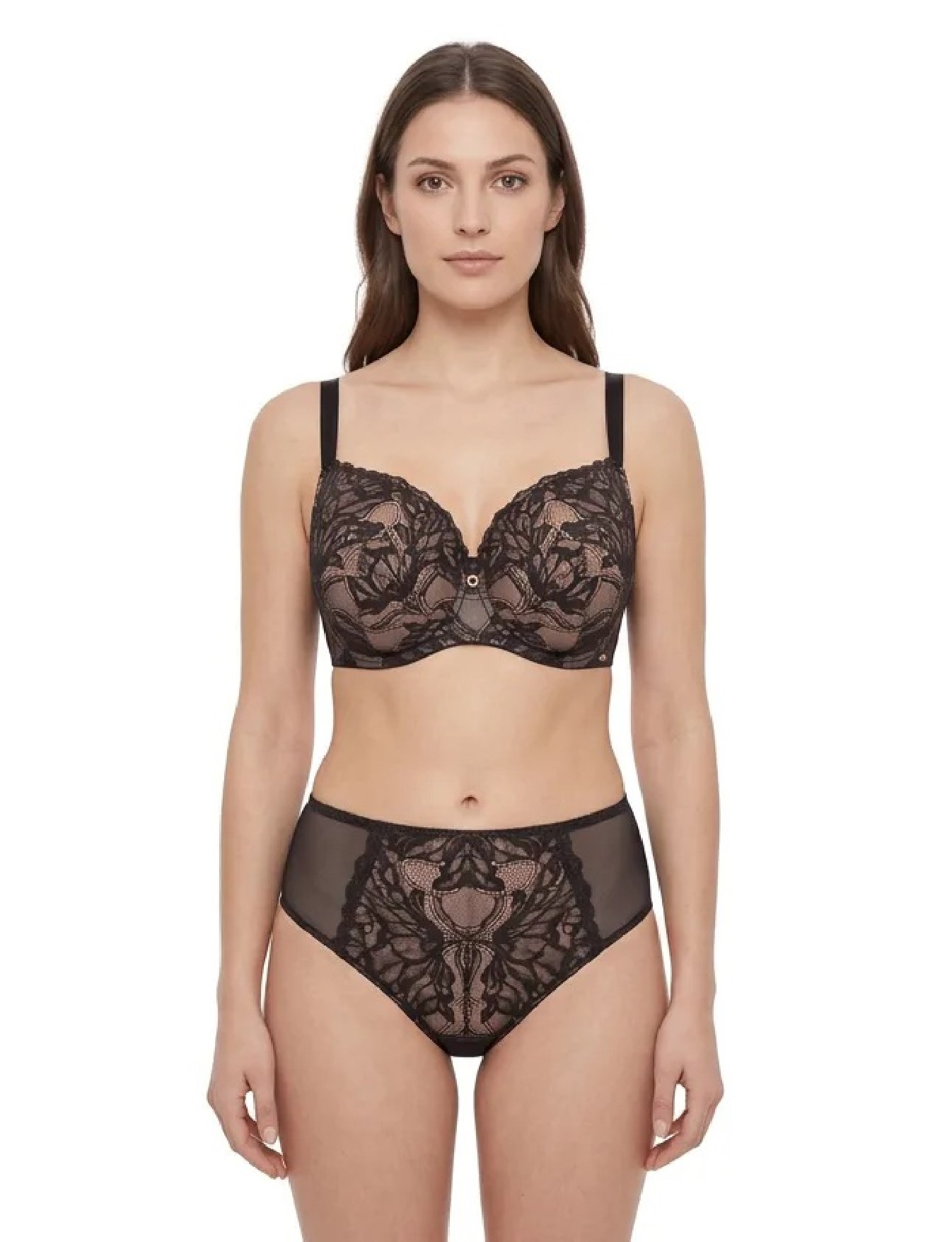 Бюст выполнен на косточках на каркасах, с дополнительными боковыми поддержками, чашки шитые, нижняя часть на тонком поролоне телесного цвета, с внешней стороны из кружева, внутренняя сторона проложена хлопковым трикотажем, верхняя часть кружевная, продублирована телесной сеткой. Бретельки не отстгиваются, регулируются по длине, фурнитура металлическая цвета розового золота. Спинка из черной сетки продублирована телесной сеткой. На спине застжка на удлинитель, количество крючков в ряду застжки, увеличивается пропорционально размеру бюстгальтера. Бюстгальтер идеально сочетается с трусиками .Molto PU бюст