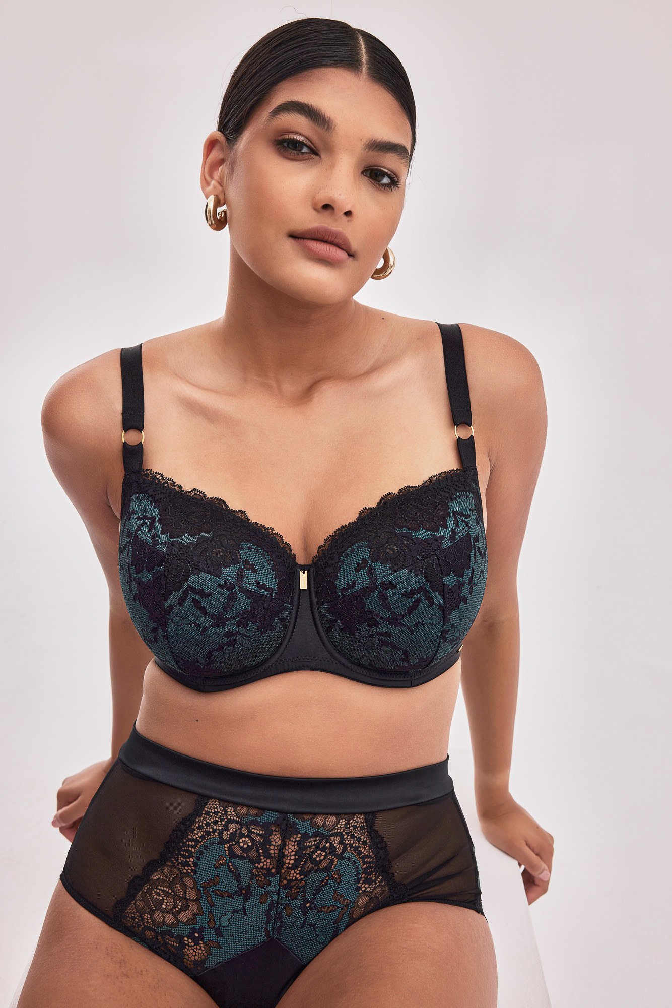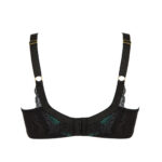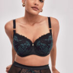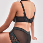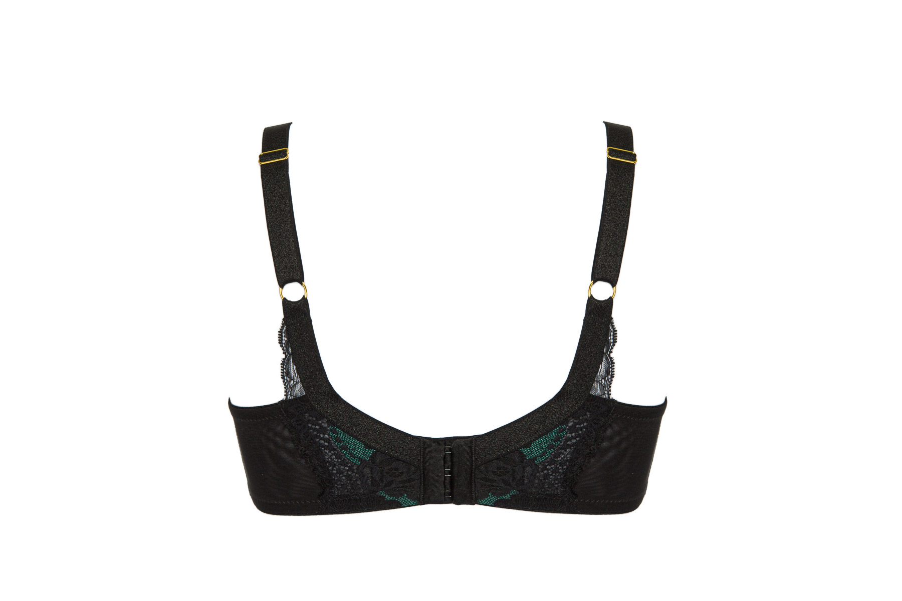 Бюстгальтер из коллекции выполнен с чашечками на косточках, с дополнительными боковыми поддержками, чашки шитые, нижняя часть из тонкого поролона, снаружи и верхняя часть чашек из черно-зеленого кружева. Спинка из двух слоев черной сетки. Бретельки регулируются по длине, не отстгиваются. На спине застжка на удлинитель, количество крючков в ряду застжки увеличивается пропорционально размеру бюстгальтера. Фурнитура металлическая цвета желтого золота. Бюстгальтер идеально сочетается с трусиками из коллекции .