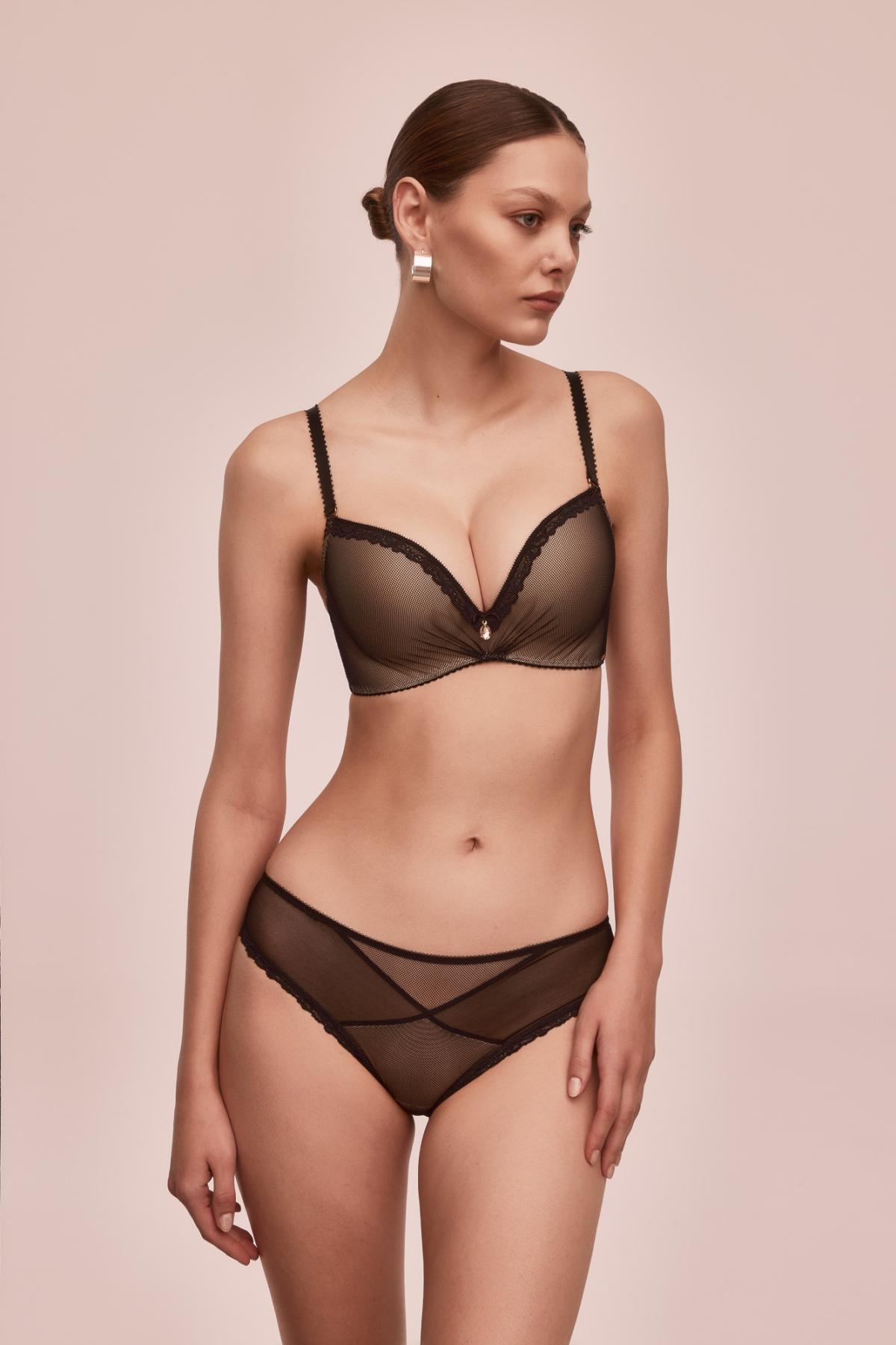 Бюстгальтер 02 - выполнен с формованными поролоновыми чашками телесного цвета без косточек, с дополнительными боковыми поддержками, внешняя сторона покрыта черной сеткой. Спинка из черной сетки продублирована телесной сеткой. Бретельки отстгиваются, регулируются по длине. На спине застжка на удлинитель, количество крючков в ряду застжки увеличивается пропорционально размеру бюстгальтера. Фурнитура металлическая цвета розового золота.Nocturn 02 Super P-UP бюст (черн)