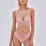 Бюстгальтер - выполнен на основе бюста - на косточках на каркасах, чашки шитые на тонком поролоне телесного цвета, со съмными пуш-ап вкладышами, внешняя сторона чашки из роскошного кружева с цветочным узором, пояс из фактурной сетки продублирован эластичной сеткой. Бретельки отстгиваются на спинке, регулируются по длине. На спине застжка на удлинитель, количество крючков в ряду застжки, увеличивается пропорционально размеру бюстгальтера, фурнитура металлическая матовая цвета меди. Между чашек украшение в виде подвески с кристаллом и атласной ленточки. Бюстгальтер идеально сочетается с трусиками .