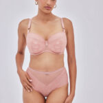 Бюст выполнен на основе бюста на косточках на каркасах, с дополнительными боковыми поддержками, чашки шитые, нижняя часть на тонком поролоне телесного цвета, с внешней стороны из кружева, внутренняя сторона проложена хлопковым трикотажем, верхняя часть кружевная, продублирована телесной сеткой. Между чашек украшение в виде красивой подвески с кристаллом и атласной ленты. Бретельки не отстгиваются, регулируются по длине, фурнитура металлическая цвета розового золота. Спинка из декоративной сетки продублирована телесной сеткой. На спине застжка на удлинитель, количество крючков в ряду застжки, увеличивается пропорционально размеру бюстгальтера. Бюстгальтер идеально сочетается с трусиками .NudeRose PU big бюст