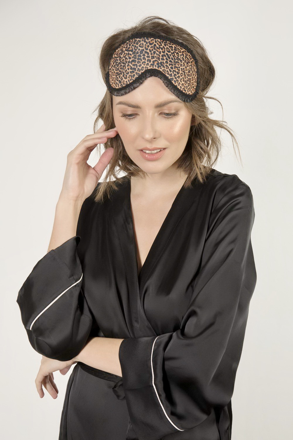Маска для комфортного сна артикул -17. Наружная сторона покрыта тканью с хищным принтом, по краю обшита рюшей из мягкого чрного капрона. Внутренняя сторона покрыта мягким дышащим хлопком. Держится маска на эластичной резинке. Размер универсальный.