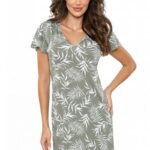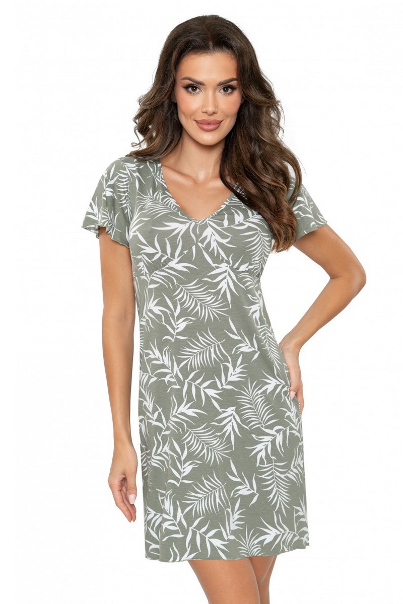 Вискозная сорочка PALOMA от европейского производителя Donna. Длина до колена, свободный рукав, под грудью прошито нестягивающими нитками для комфорта во время сна. Элегантный рисунок листьев на всей рубашке. На сайте указан европейский размер! К европейскому размеру +6.