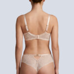 Бюстгальтер выполнен на основе бюста косточках на каркасах, с дополнительными боковыми поддержками, чашки шитые, нижняя часть на тонком поролоне, внутренняя сторона проложена хлопковым трикотажем, внешняя и верхняя часть чашки из кружевного полотна с эффектом мерцания, спинка кружевная продублирована телесной сеткой. Бретельки отстгиваются на спинке, регулируются по длине. На спине застжка на удлинитель, количество крючков в ряду застжки, увеличивается пропорционально размеру бюстгальтера, фурнитура металлическая цвета желтого золота. Бюстгальтер идеально сочетается с трусиками .