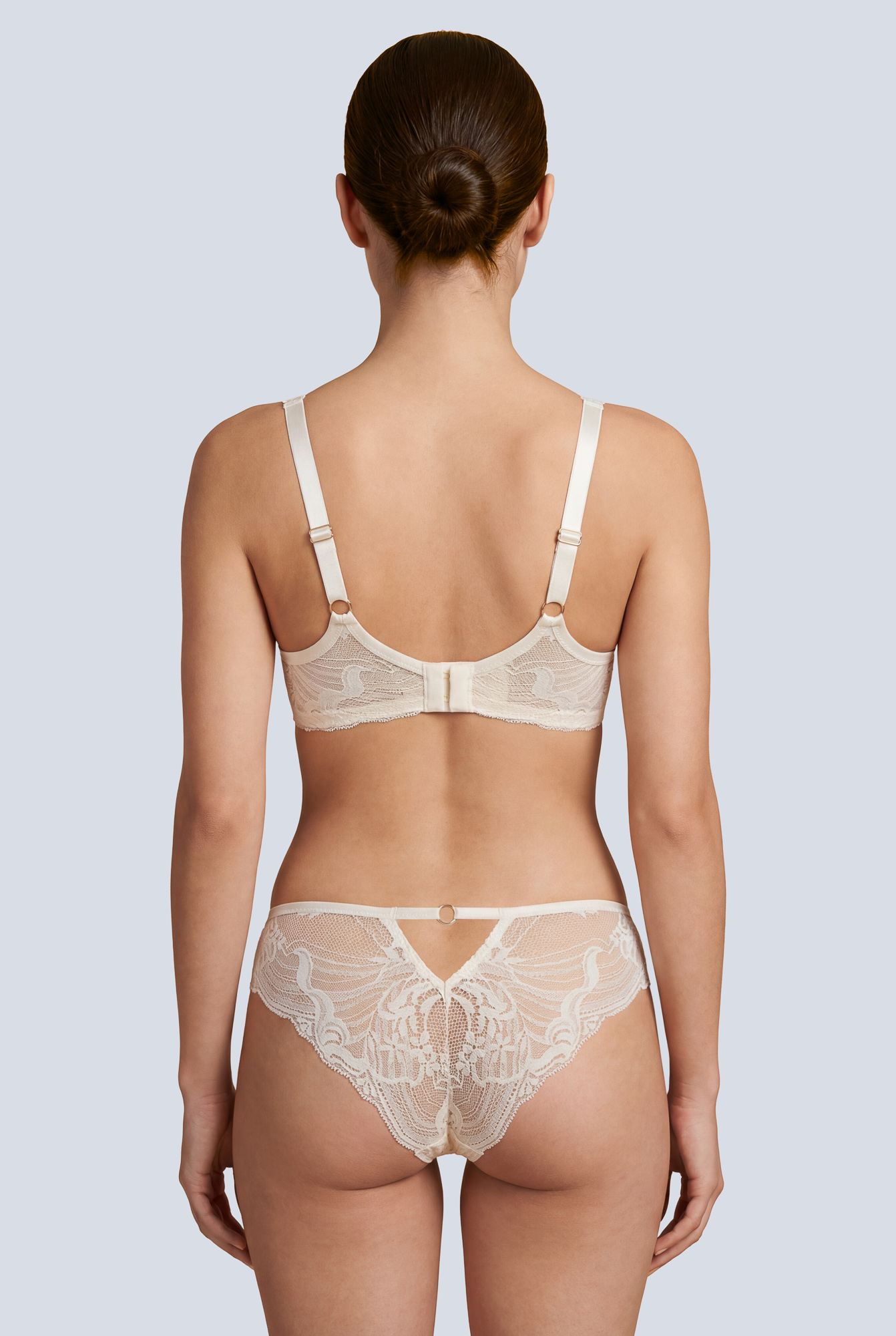 Бюстгальтер бралетт выполнен на основе бюста в цвете , на косточках, с дополнительными боковыми поддержками, чашки шитые из нежного кружева. Спинка из кружева продублирована сеткой. Бретельки не отстгиваются на спинке, регулируются по длине. На спине застжка на удлинитель, фурнитура металлическая цвета желтого золота. Бюстгальтер идеально сочетается с трусиками .PureRomantic M бралетт бюст