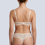 Бюстгальтер - выполнен на основе бюста - в цвете , на косточках, с дополнительными боковыми поддержками, чашки шитые на тонком поролоне телесного цвета, со съмными пуш-ап вкладышами, внешняя сторона покрыта нежным кружевом. Спинка из кружева продублирована сеткой. Бретельки отстгиваются на спинке, регулируются по длине. На спине застжка на удлинитель, фурнитура металлическая цвета желтого золота. Бюстгальтер идеально сочетается с трусиками .