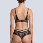 Бюстгальтер из коллекции - выполнен на основе бюста - с формованными поролоновыми чашками телесного цвета без косточек, покрытыми нежным черным кружевом, с дополнительными боковыми поддержками для предотвращения скручивания. Бретельки не отстгиваются, регулируются по длине. На спине застжка на удлинитель, количество крючков в ряду застжки увеличивается пропорционально размеру бюстгальтера. Пояс из черной сетки продублирован телесной сеткой. Фурнитура металлическая цвета меди. Бюстгальтер идеально сочетается с трусиками из коллекции .RichEnough Super P-UP бюст