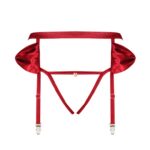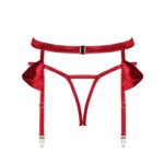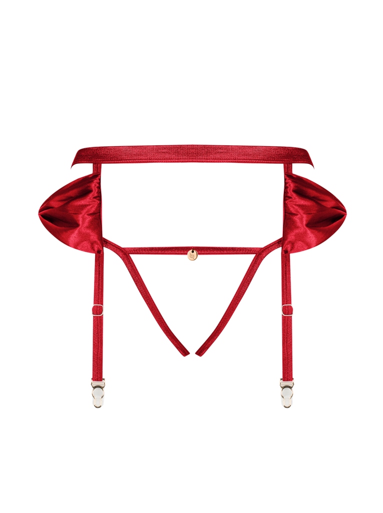Комплект из коллекции 2 в 1 пояс для чулок и стринги с открытой промежностью из красных эластичных союзок. У пояса на спине застежка, пажи для чулок регулируются по длине, на бедрах атласные банты. Отлично сочетается с чулками 808.Rubinesa garter belt пояс стринги с вырезом