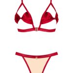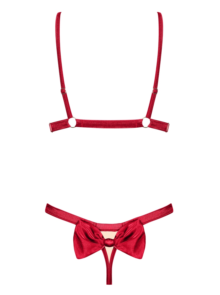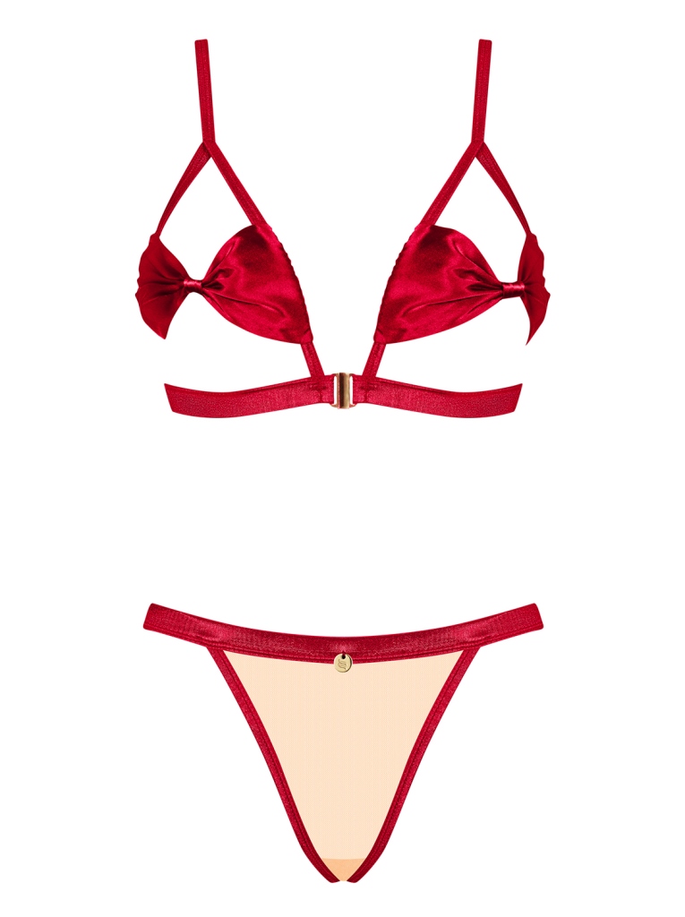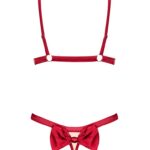 -трусики стринги из комбинации ткани телесного цвета и красного атласа, ягодицы украшает атласный бант.