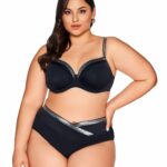 Трусы классические женские арт. 224/15 для пляжного отдыха, со средней линией талии, спереди на стрейч-подкладке. Глубокий черный цвет прекрасно гармонирует с серебряным блеском ленты, венчающей пояс трусов, фигурный пояс скрывает недостатки фигуры, делает талию визуально тоньше. Отлично сочетаются с бюстами 224.SF224/15 трусы пляжные