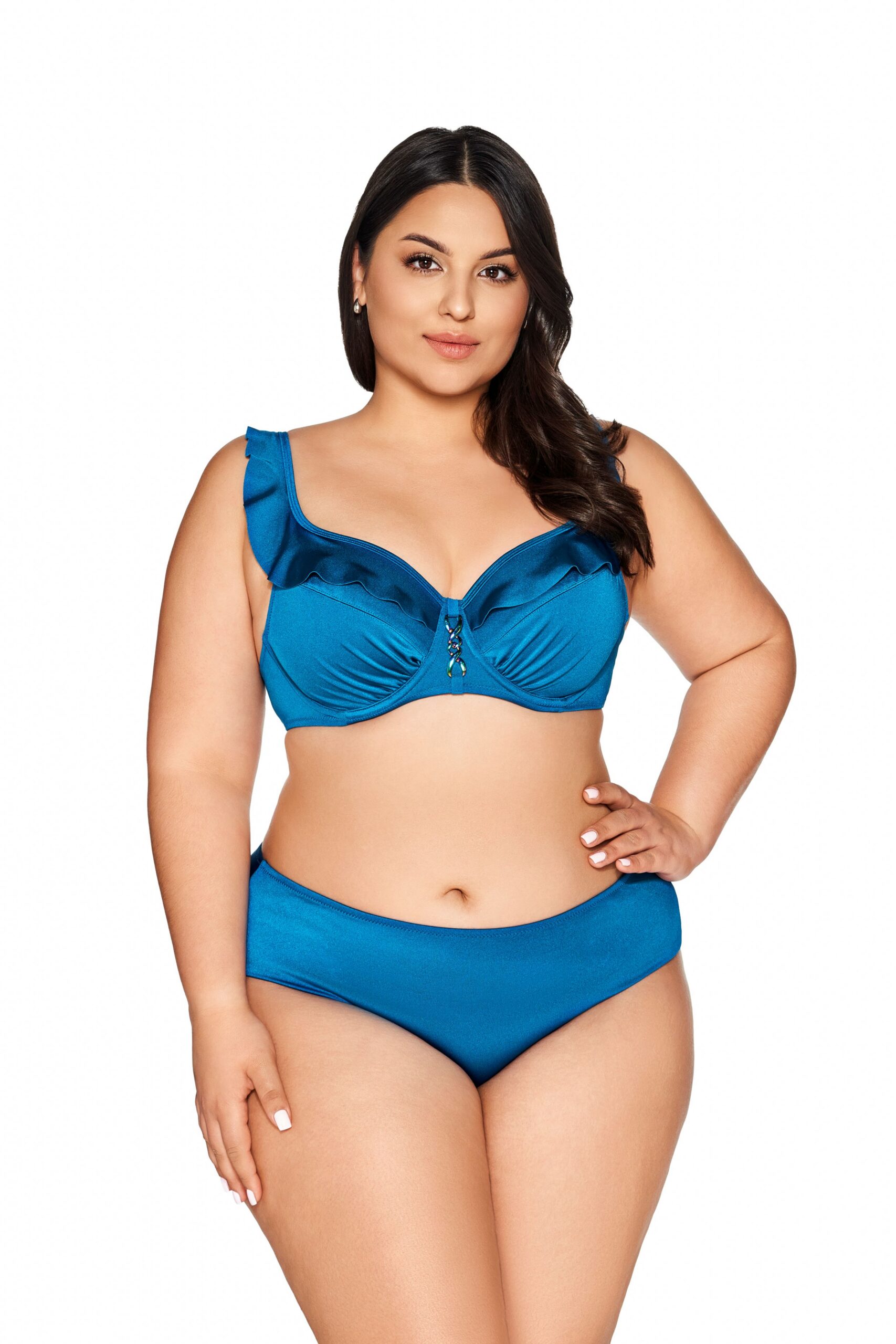 Бюстгальтер пляжный 213 выполнен в цвете лазурный с мягкими шитыми чашками, на косточках, продублирован сеткой, тонкие бретели регулируются по длине, на спине металлическая застжка, бретели и верх чашек декорированы рюшей, ажурная драпировка в нижней части чашек оптически подчеркивает грудь. Пояс продублирован стабилизирующей сеткой. Фурнитура металлическая цвета бензина. Бюстгальтер цвета океана побуждает вас отправиться в отпускное приключение. Отлично сочетается с трусами 13/2, 13/5.SK213 M бюст пляжный (сапфир)