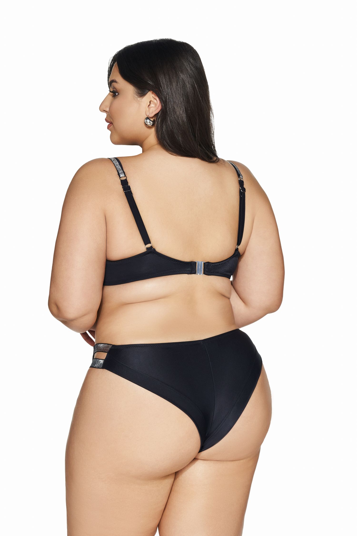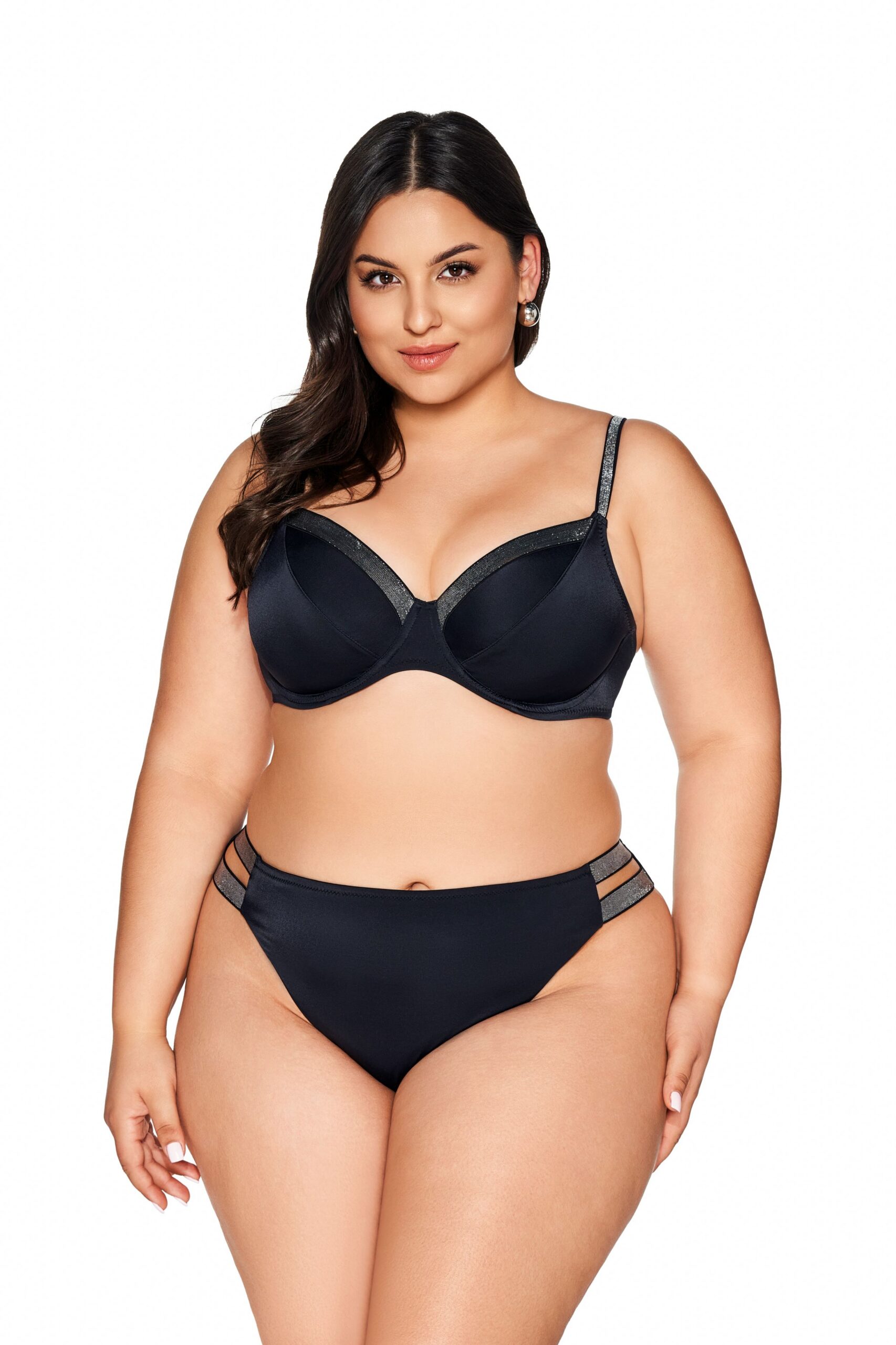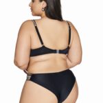 Бюстгальтер пляжный 225 выполнен с мягкими шитыми чашками, на косточках, в боковой части чашки дополнительная поддержка из сетки, сложенной вдвое в размерах 65, 70, 75, 80 , 85, 90, 95, 100, 105, бретели регулируются по длине, на спине металлическая застжка. Пояс продублирован стабилизирующей сеткой. Глубокий черный цвет прекрасно гармонирует с серебряным блеском ленты, венчающей чашки и бретели, сверкающая деталь декольте подчеркивает аппетитные формы. Комплектуется с трусами 224/15, 225/16.