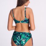 Бюстгальтер пляжный 235 выполнен в цвете с шитыми мягкими чашками с тонким поролоном, на косточках, бретели регулируются по длине, декоративные кольца на бретельках добавляют изысканности и привлекают внимание, на спине металлическая застжка, фурнитура цвета желтого золота. Пояс продублирован стабилизирующей сеткой. Тропический мотив в темно-зеленых тонах на темно-синем фоне, вдохновленный экзотической природой, придает всему изделию изысканный и роскошный вид. Отлично сочетается с трусами 235/2, 236/3.