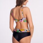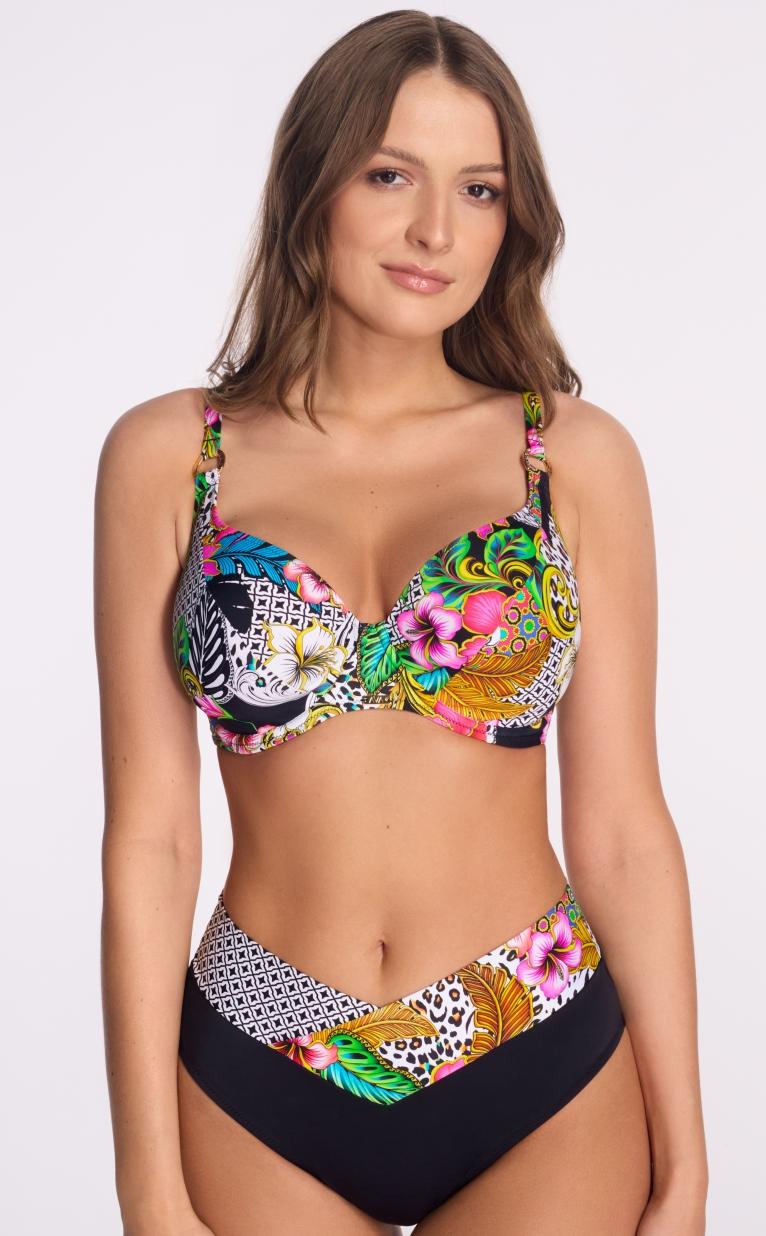 Бюстгальтер пляжный 237 выполнен в цвете с шитыми мягкими чашками, на косточках, бретели регулируются по длине, декоративные кольца на бретельках добавляют изысканности и привлекают внимание, на спине металлическая застжка, фурнитура цвета желтого золота. Пояс продублирован стабилизирующей сеткой. Цветочно-лиственный принт в сочетании с геометрическими акцентами создает уникальную летнюю композицию. Отлично сочетается с трусами 237/3, 238/15, 239/17.SK238 M Maxi бюст пляжный
