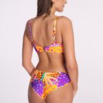 Бюстгальтер пляжный 241 выполнен в цвете с шитыми мягкими чашками, на косточках, бретели регулируются по длине, на спине металлическая застжка, фурнитура цвета розового золота. Пояс продублирован стабилизирующей сеткой. Эффектный тропический узор в ярких оттенках фиолетового и оранжевого привлекает внимание и подчркивает роскошный характер изделия. Отлично сочетается с трусами 240/2, 241/5.
