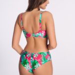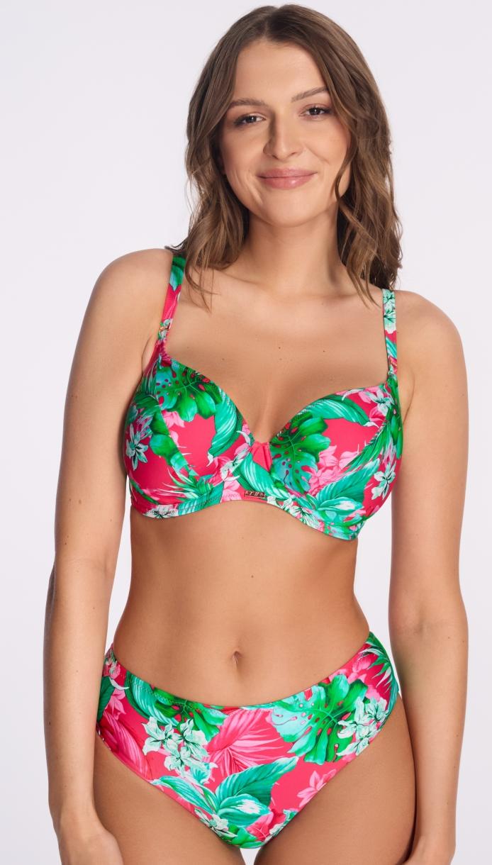 Бюстгальтер пляжный 245 выполнен в цвете с шитыми мягкими чашками, на косточках, бретели регулируются по длине, декорированы металлическими элементами с кристаллами, на спине металлическая застжка, фурнитура цвета розового золота. Пояс продублирован стабилизирующей сеткой. Тропический принт ярко-красного цвета в сочетании с контрастными зелеными листьями и белыми цветами создает ощущение свежести, лета и женственной легкости. Это идеальный выбор для любительниц ярких, привлекающих внимание цветов. Отлично сочетается с трусами 244/2, 245/5.