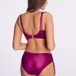 Бюстгальтер пляжный 248 выполнен в цвете фуксия из слегка мерцающей ткани насыщенного цвета, которая прекрасно подчеркивает летний загар и эксклюзивность наряда, с шитыми чашками с тонким поролоном, на косточках, продублирован сеткой, тонкие бретели регулируются по длине, декоративные кольца на бретельках добавляют изысканности и привлекают внимание, на спине металлическая застжка, ажурная драпировка в нижней части чашек оптически подчеркивает грудь. Пояс продублирован стабилизирующей сеткой. Фурнитура металлическая цвета розового золота. Отлично сочетается с трусами 248/2, 249/5.
