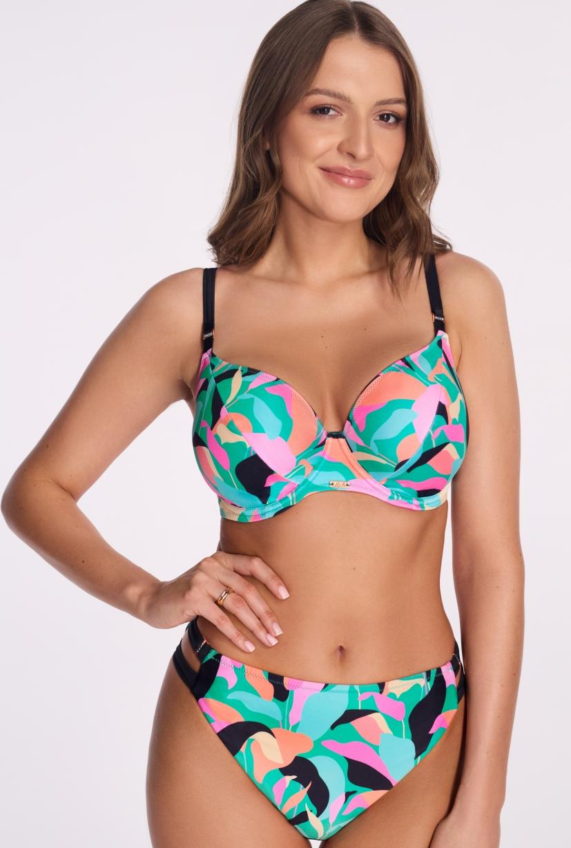 Бюстгальтер пляжный 251 выполнен в цвете с шитыми мягкими чашками, на косточках, черные бретели регулируются по длине, декорированы металлическими элементами с кристаллами, на спине металлическая застжка, фурнитура цвета розового золота. Пояс продублирован стабилизирующей сеткой. Яркий тропический принт сочетает оттенки бирюзового, розового, оранжевого, фуксии и черного, создавая гармоничную композицию, которая прекрасно смотрится на фоне загорелой кожи. Отлично сочетается с трусами 250/3, 251/16.SK251 M Maxi бюст пляжный
