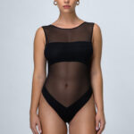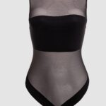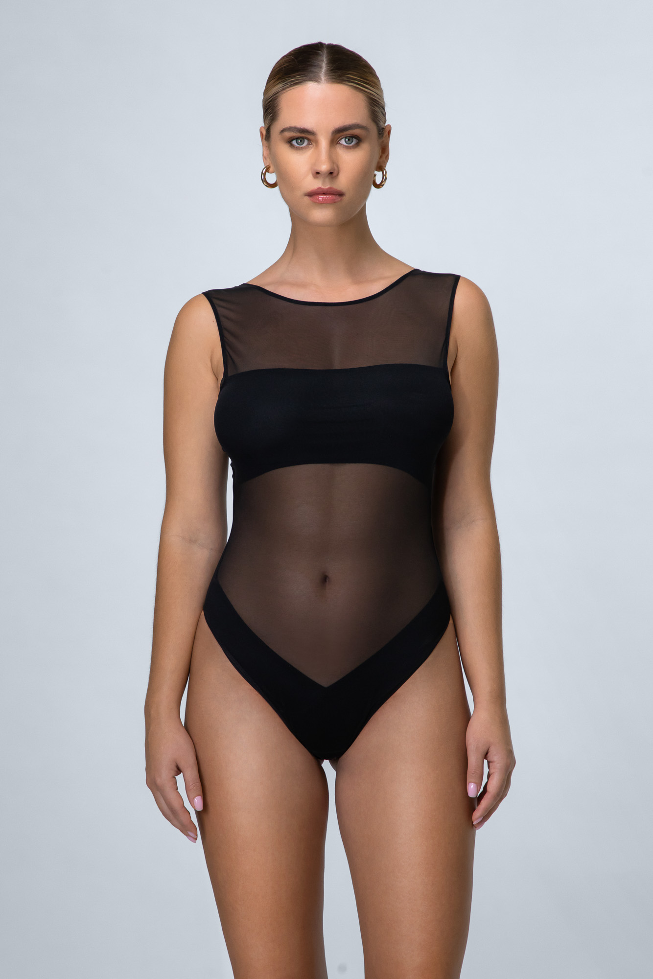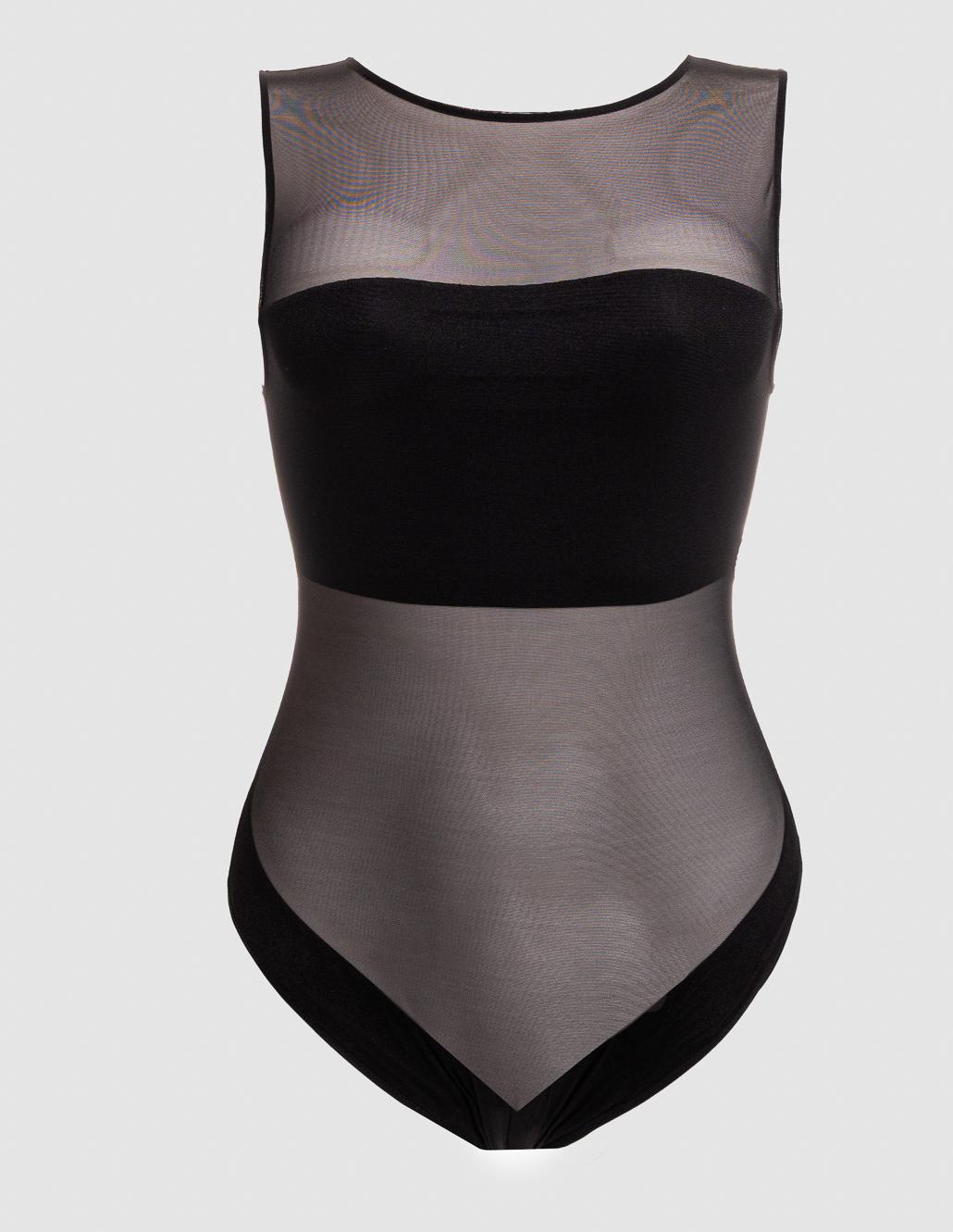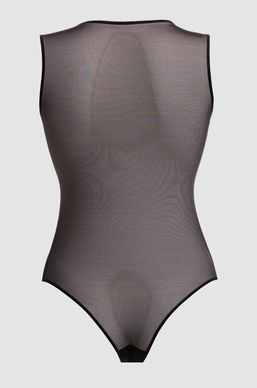 Боди выполнено из эластичной нежной сетки, спереди на груди и на ягодицах продублировано эластичной черной тканью, ластовица из 100 хлопка, застежка на двух металлических кнопках.Skim боди